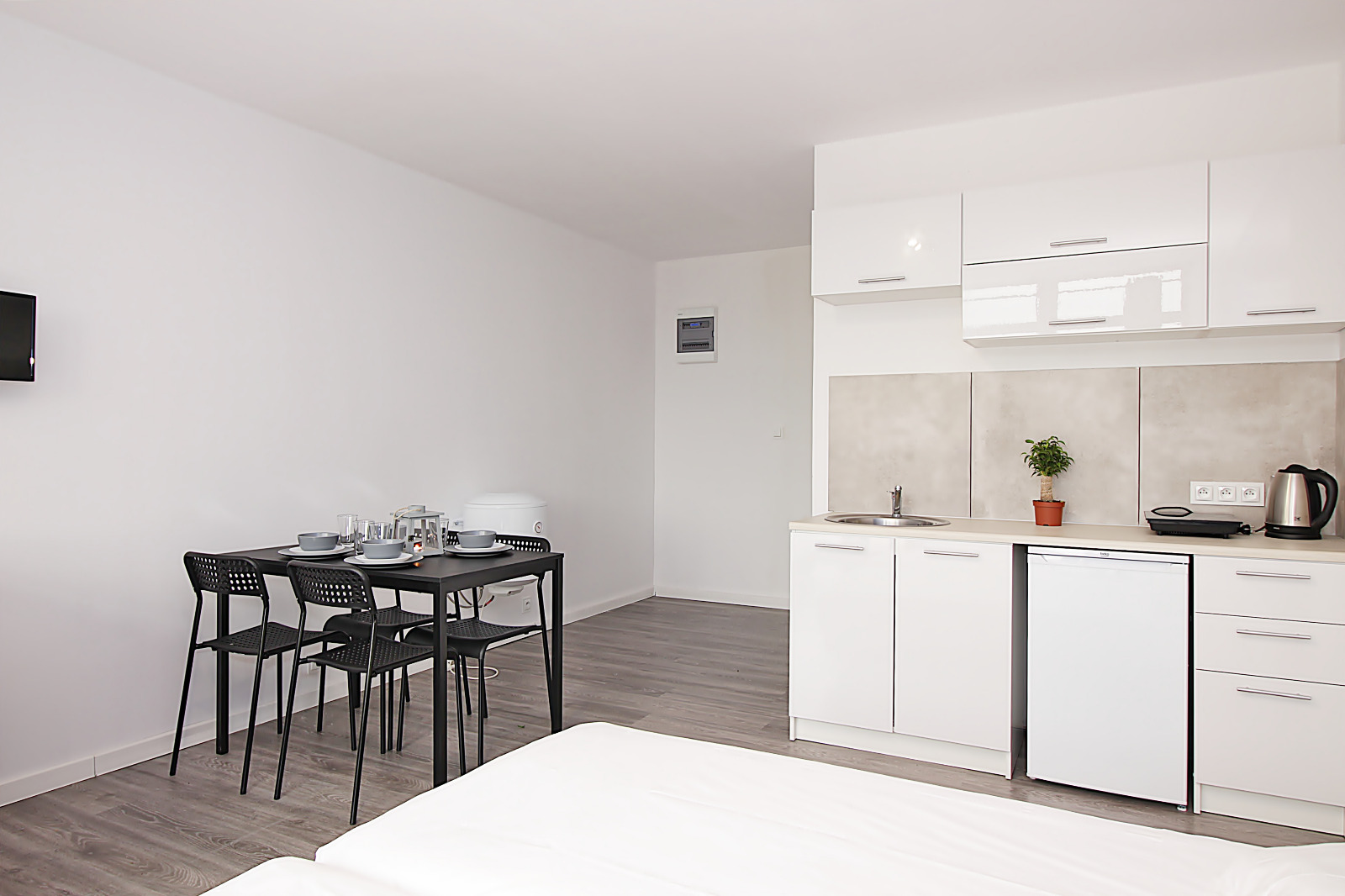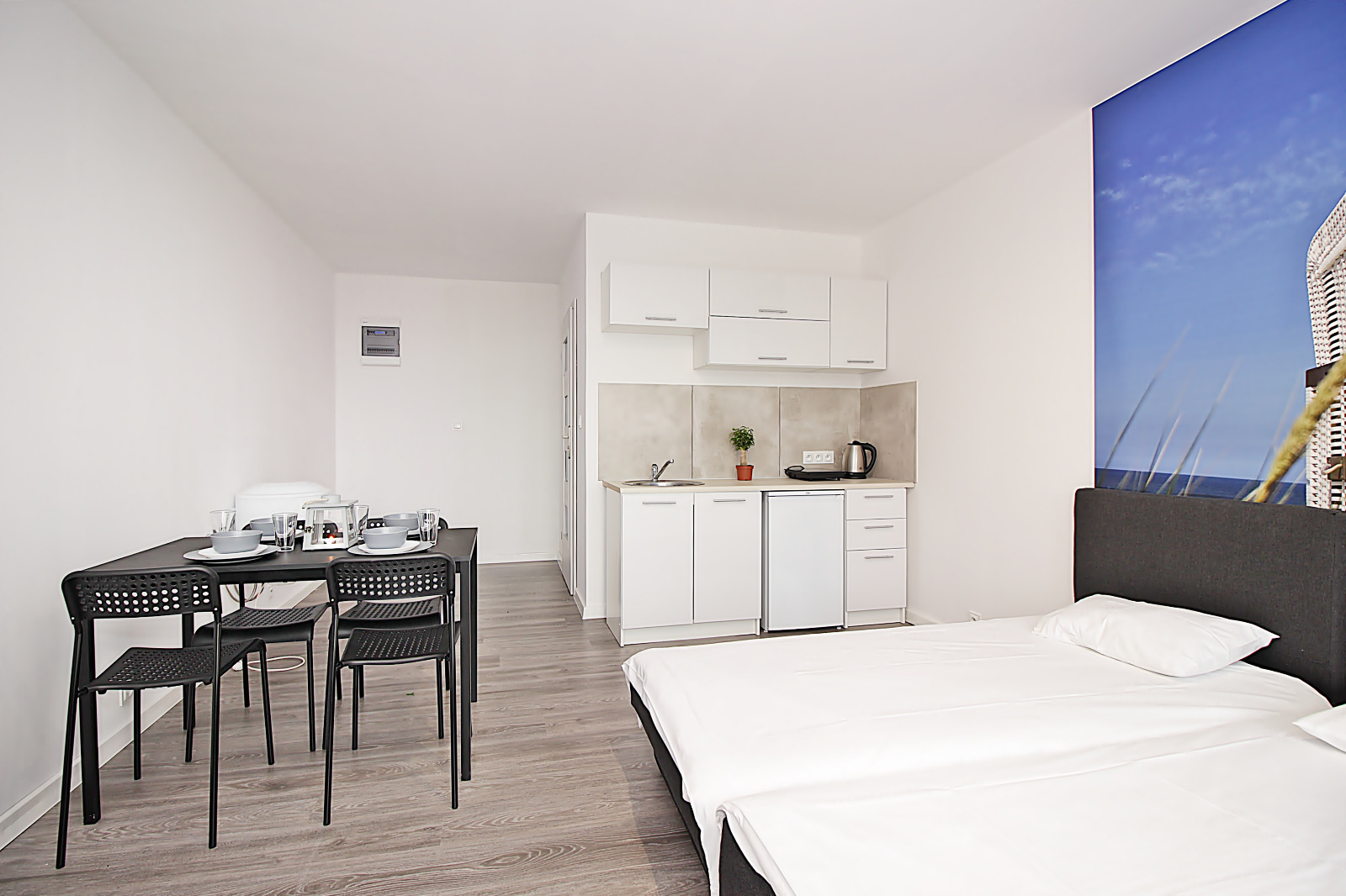- 4 x Studio – każde o powierzchni 28 m2 z w pełni wyposażonym aneksem kuchennym i łazienką;