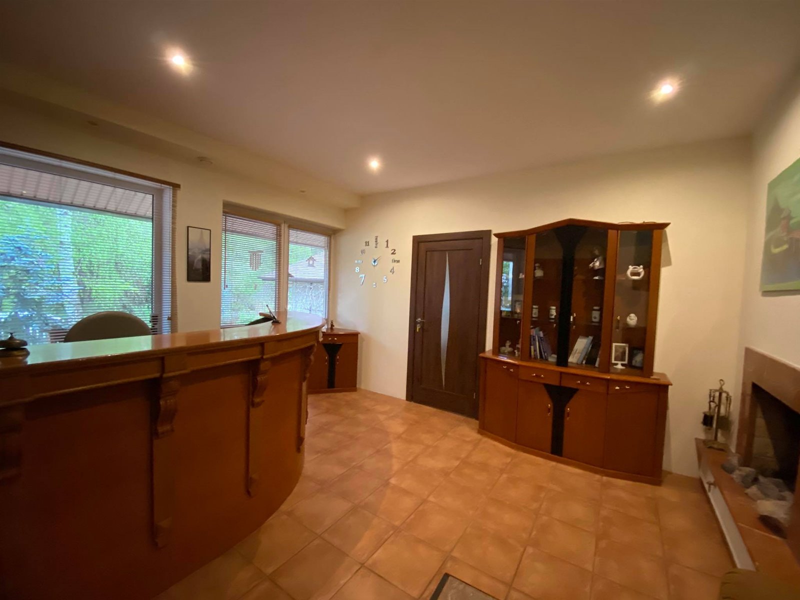 - pomieszczenia mieszkalne na partere (120 m2): otwarty salon z 2 kominkiemi i 2 wyjściemi na taras, 2 gabineta, 3 łazienki z WC, 2 kuchni z jadalnią oraz hall,