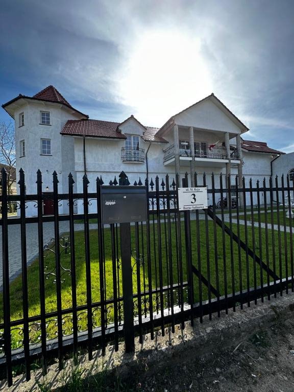 Teren wokół budynku jest ogrodzony i wyposażony w miejsca parkingowe dla gości.