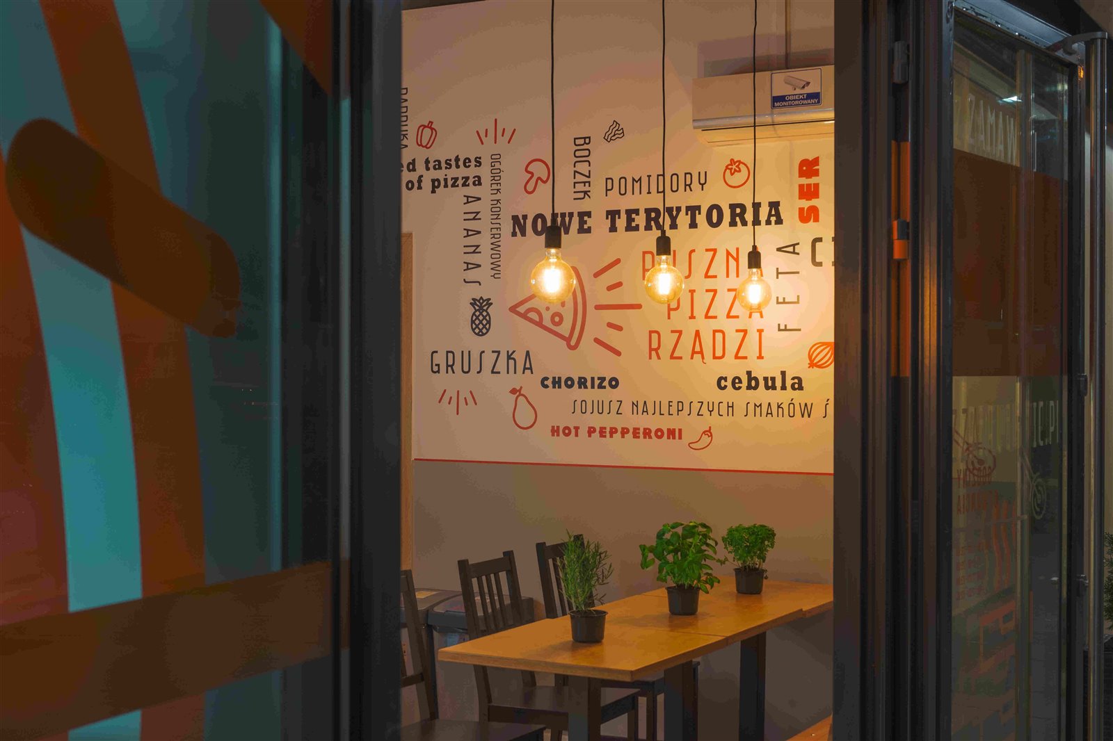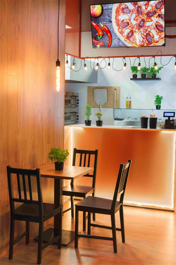 - pełne wyposażenie kuchni (piec do pizzy, stół pizzerski, lodówki, zlewy, blaty robocze, kompletne wyposażenie kuchni i magazynku itp.),
