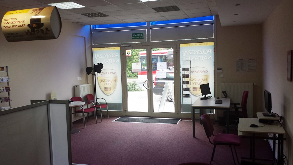 Placówka dwu stanowiskowa (możliwość 3) oraz kiosk bankowości internetowej o łącznej powierzchni 70 m2 na co składają się duża sala dla klientów, pokój dla VIPów, biuro kierownika, łazienka, kuchnia wraz z pomieszczeniem socjalnym.