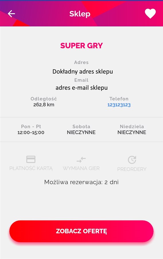 Na sprzedaż wystawiam kompletną DG która jest twórcą i właścicielem platformy sprzedażowej przeznaczonej dla stacjonarnych sklepów z grami. Platforma umożliwia udostępnienie pełnej oferty produktów (gry, konsole, akcesoria) w aplikacji mobilnej na telefony z Android i iOS. Sklepy udostępniają towary posiadane na stanie a ich klienci otrzymują możliwość: rezerwacji towaru, ustawienia powiadomień dla tytułów premierowych, obserwacji wszystkich dostaw towarów które pojawiły się w sklepie, przeszukiwania lokalnych punktów pod kątem dostępności wybranych pozycji i wiele innych. Dodatkowo sprzedawcy dysponują funkcją wysłania powiadomienia Push do wszystkich swoich klientów, raz na 7 dni.