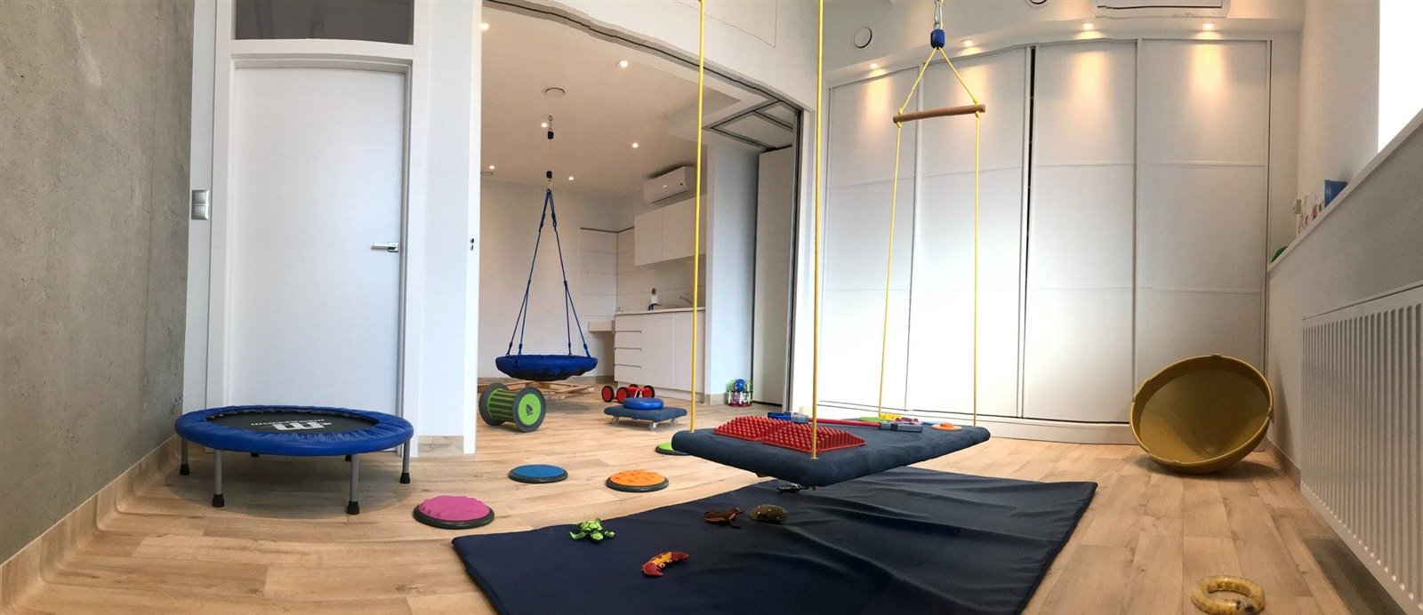Mniejsza sala przeznaczoana na zajęcia logopedyczne / psychologiczne /pedagogiczne/terapia ręki oraz druga sala większa do prowadzenia zajęć grupowych / fizjoterapeutycznych / integracji sensorycznej.