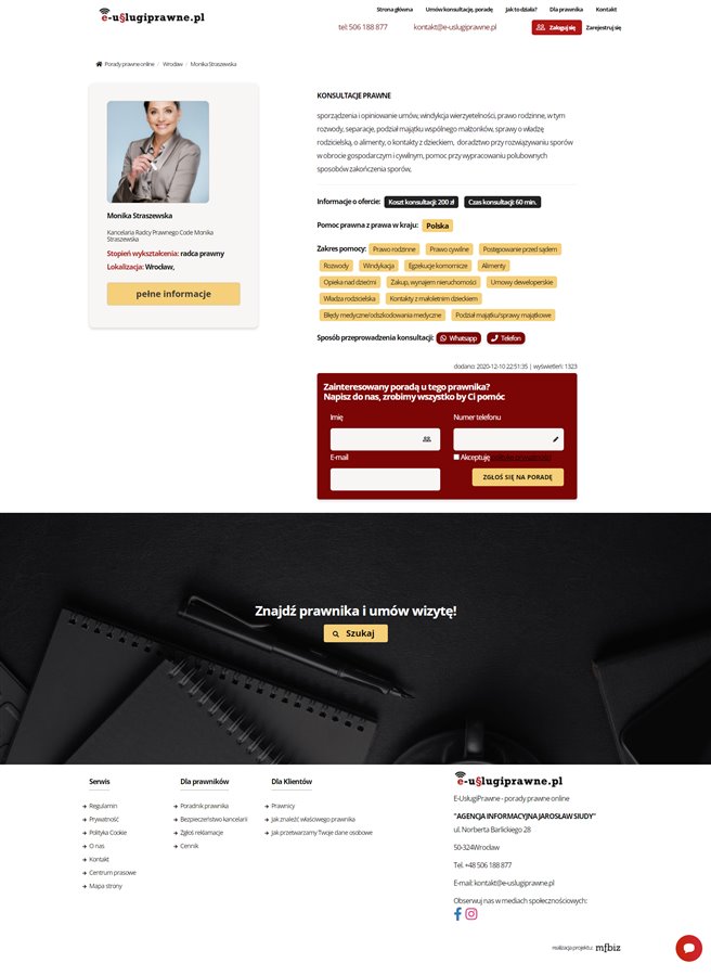 To wirtualne miejsce spotkań specjalistów z szeroko rozumianego prawa oraz klientów. Portal jest zoptymalizowany pod względem funkcjonalności, posiada mechanizmy samodzielnego zarządzania profilami przez prawników oraz profile klientów. Dodatkowo panel zarządzania dla administratora pozwala zarządzać ofertami dodanymi przez prawników oraz śledzić statystyki, pobierać faktury (automatycznie generowane przez system po zakupie porady przez klienta).