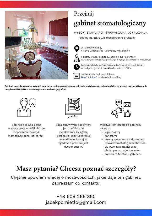 Gabinet stomatologiczny z 1 unitem, kompletnie wyposażony, gotowy do natychmiastowego podjęcia pracy. Zlokalizowany jest w centrum Czechowic-Dziedzic w małej klinice wielospecjalistycznej. Powierzchnia całkowita lokalu: 20 m + 6,8 m powierzchni wspólnej.