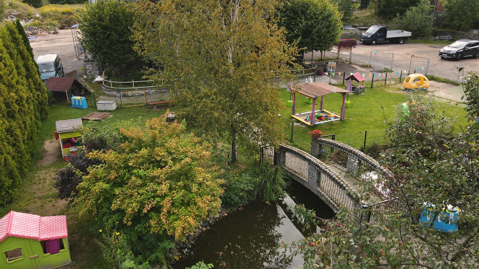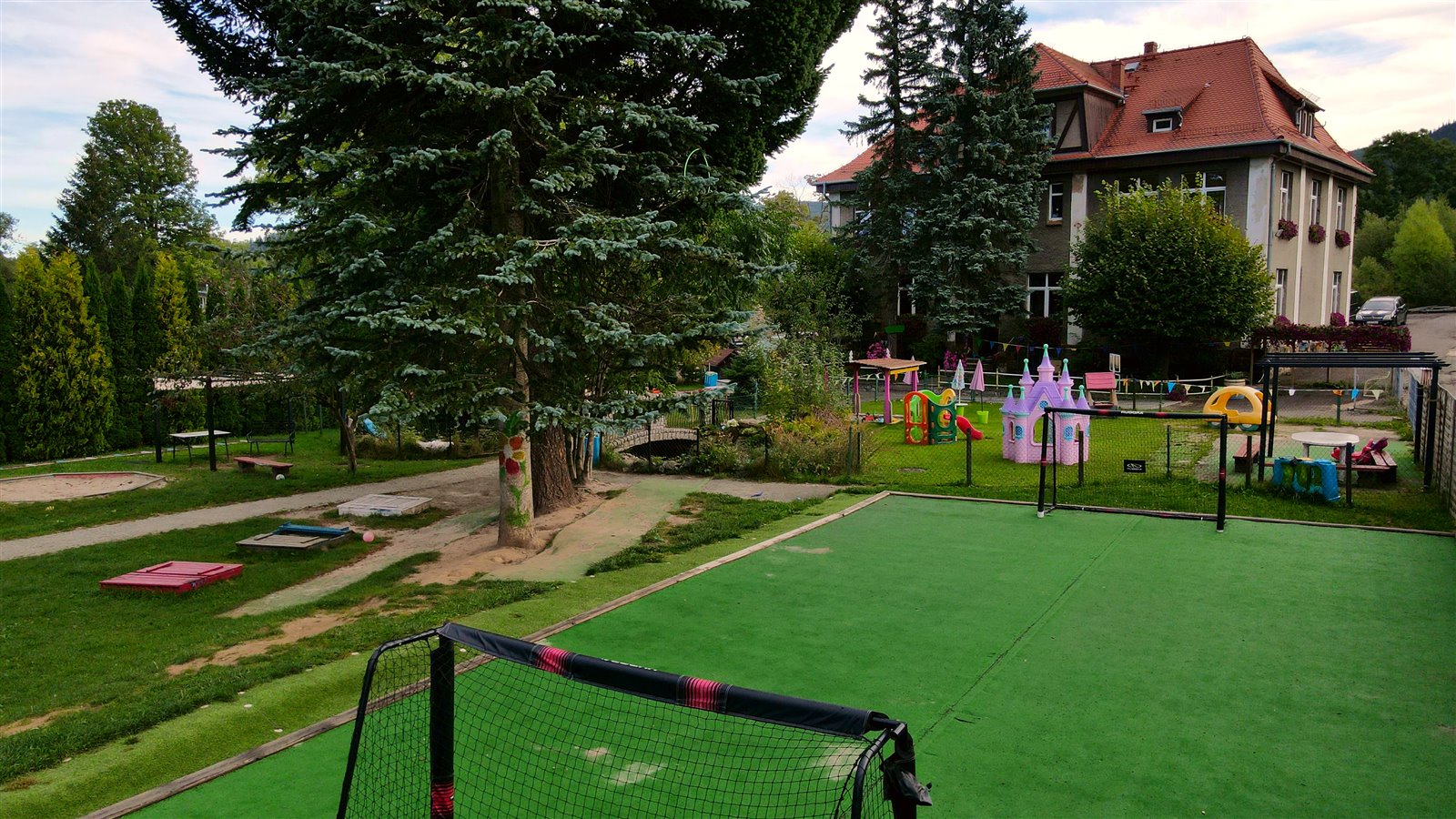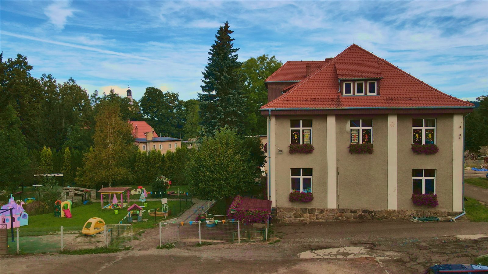 Budynek o powierzchni całkowitej 742,59m2 (trzykondygnacyjny z podpiwniczeniem, pow. zabudowy 242,53m2), duży plac zabaw przed placówką, w całości ogrodzony. Plac zabaw wyposażony w m. in.: boisko, piaskownicę, zjeżdżalnie czy oczko wodne z mostkiem (zabezpieczone przed dostępem dzieci) oraz cały szereg zabawek ogrodowych przystosowanych do wieku dzieci. Obiekt posiada własny parking na ok. 20 aut, cicha i spokojna okolica – obrzeża miasta. Dookoła bardzo dużo zieleni, łąki, lasy, mnóstwo terenów spacerowych, przepiękne krajobrazy oraz steki atrakcji turystycznych, ponieważ oferta znajduje się na terenie tzw. "Doliny Pałaców i Ogrodów".