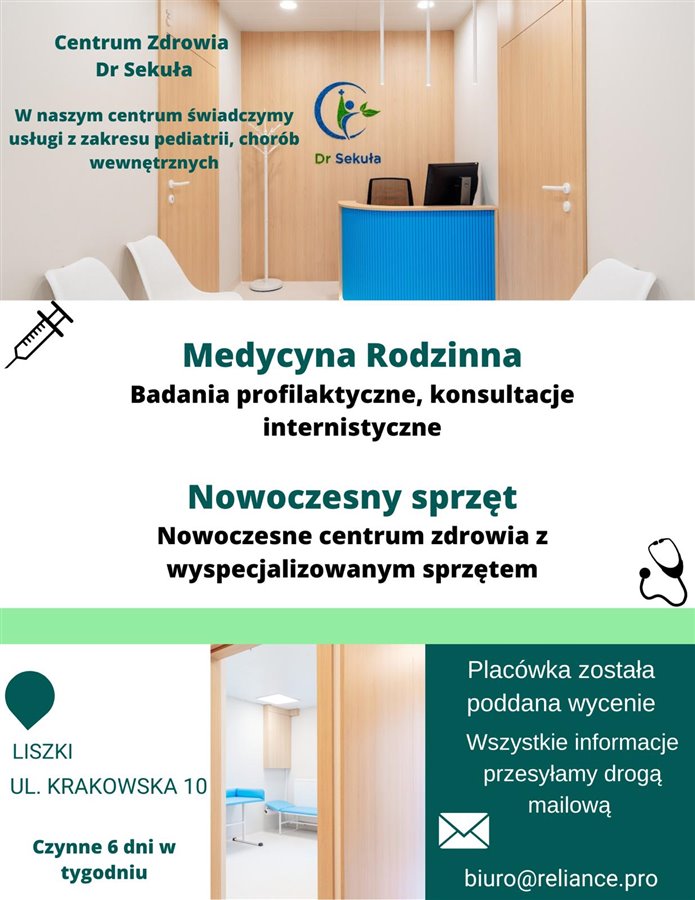 Sprzedam przychodnię komercyjną działającą pod Krakowem. Porady głównie w zakresie pediatrii (80%) i interny (20%).
