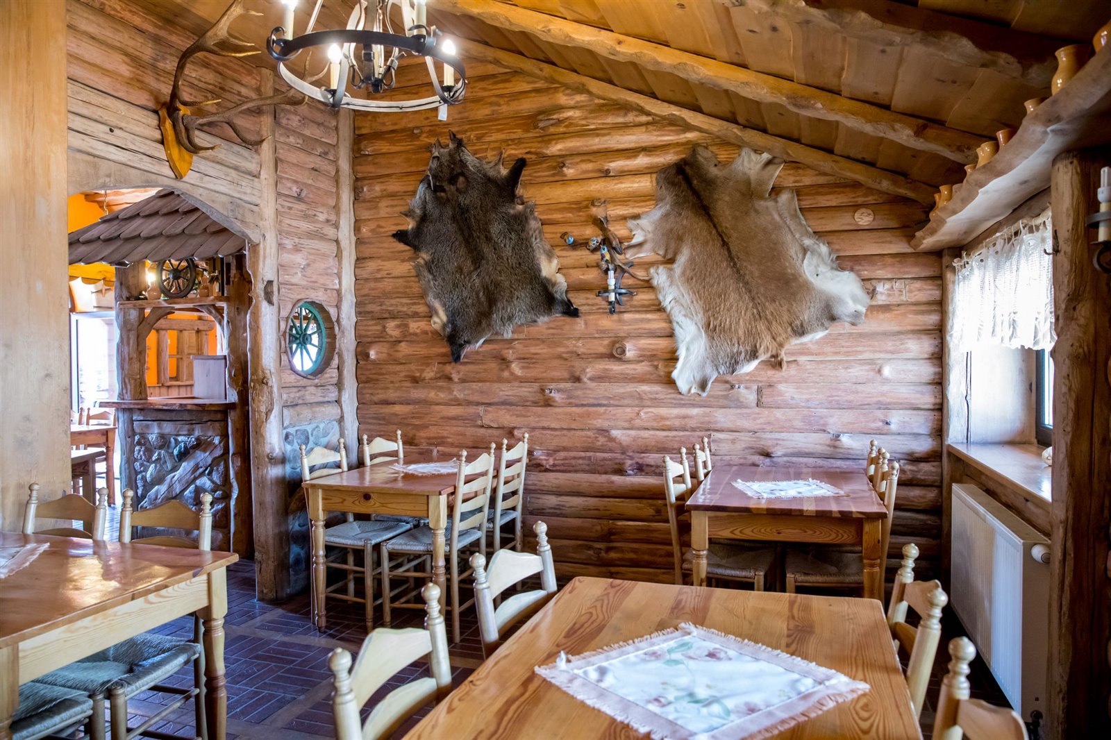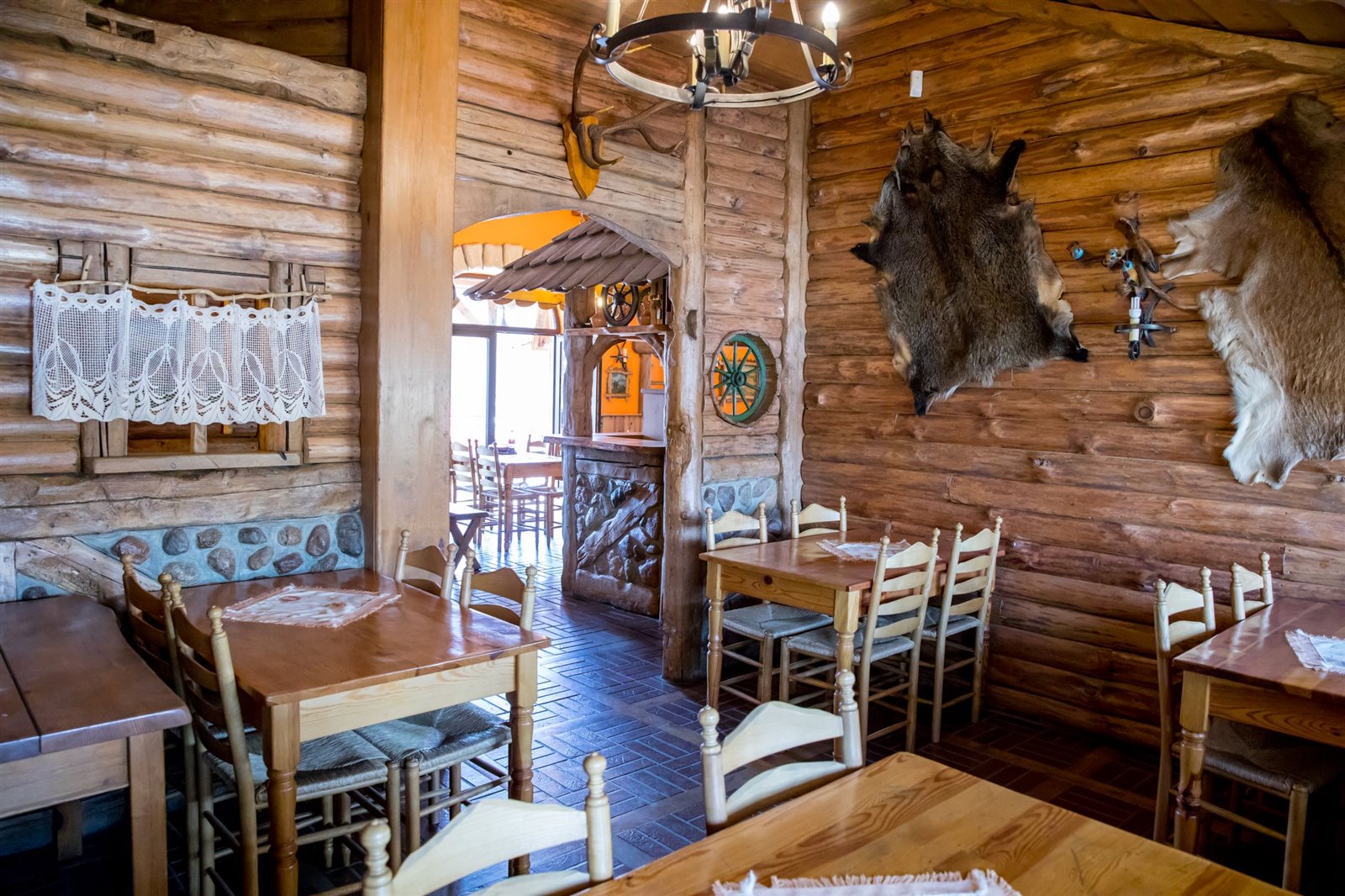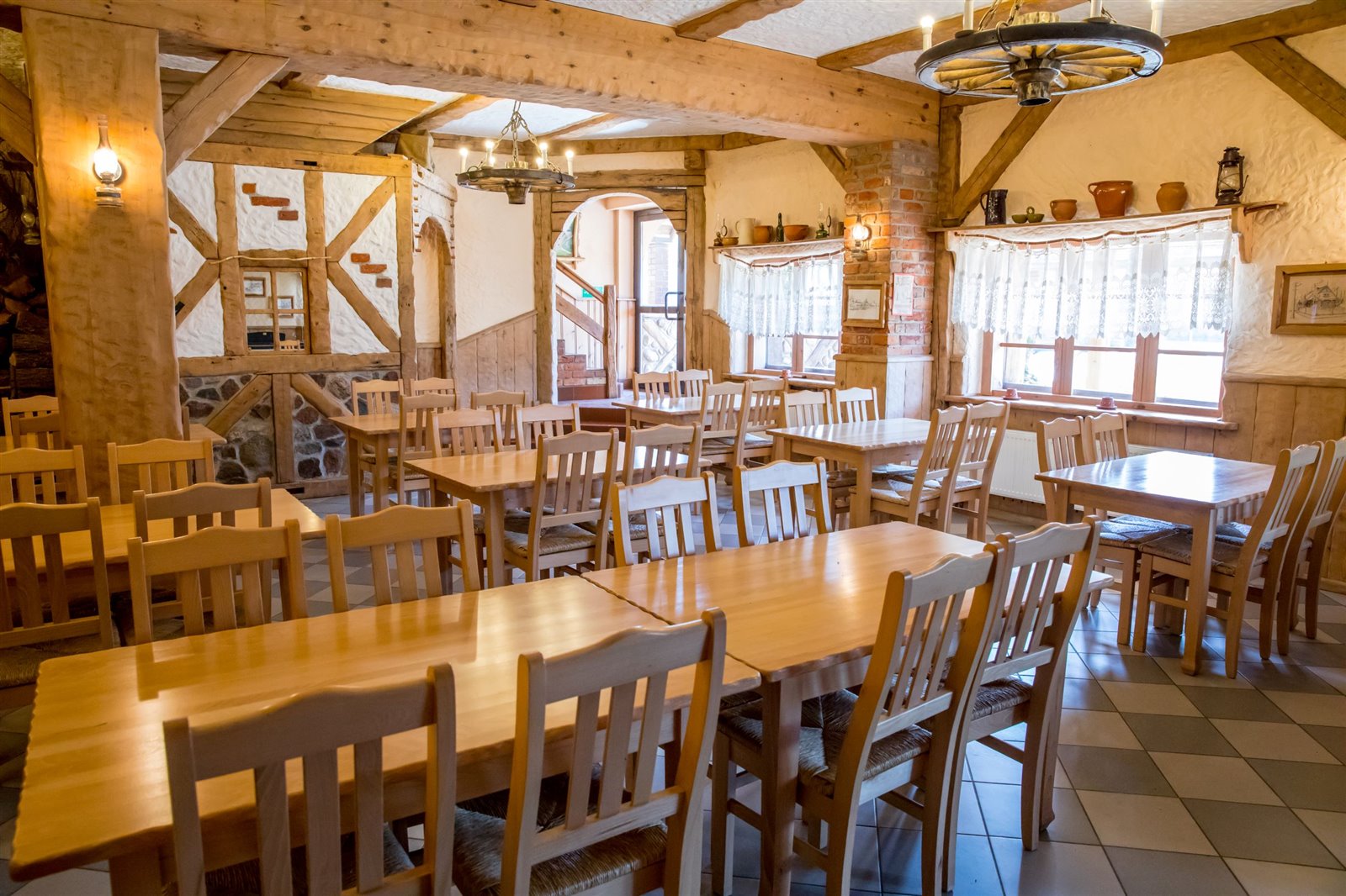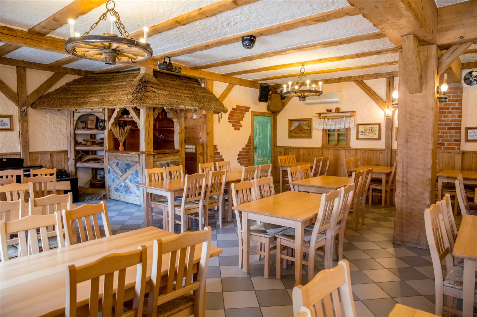 2 sale jadalne o powierzchni około 61 m2, połączone drewnianym barem, robionym na wzór Mazurskiej Chaty; sale są wyposażone w 9 stołów i 36 krzeseł; z większej sali wychodzi się na otaczający budynek taras widokowy, który z sukcesem służył jako letni ogródek z 5 stołami i 10 ławami.
