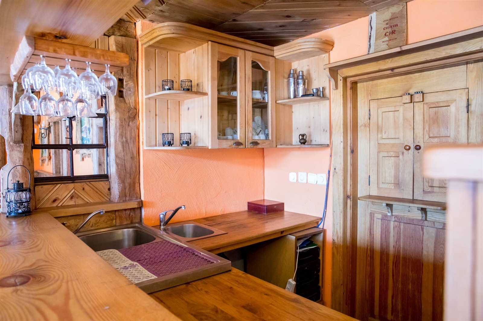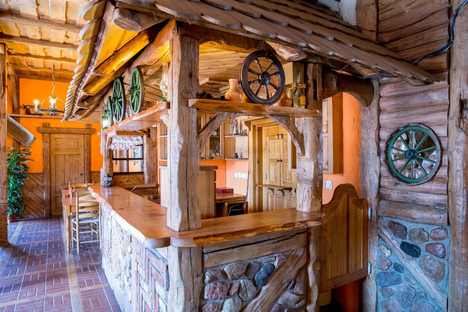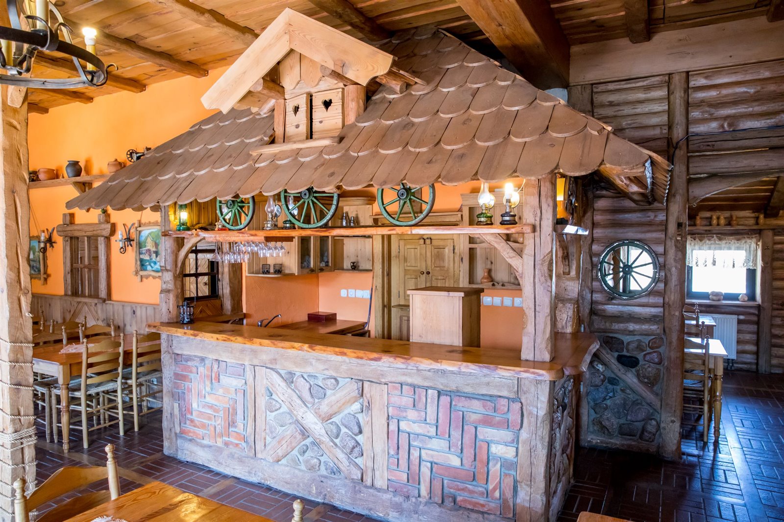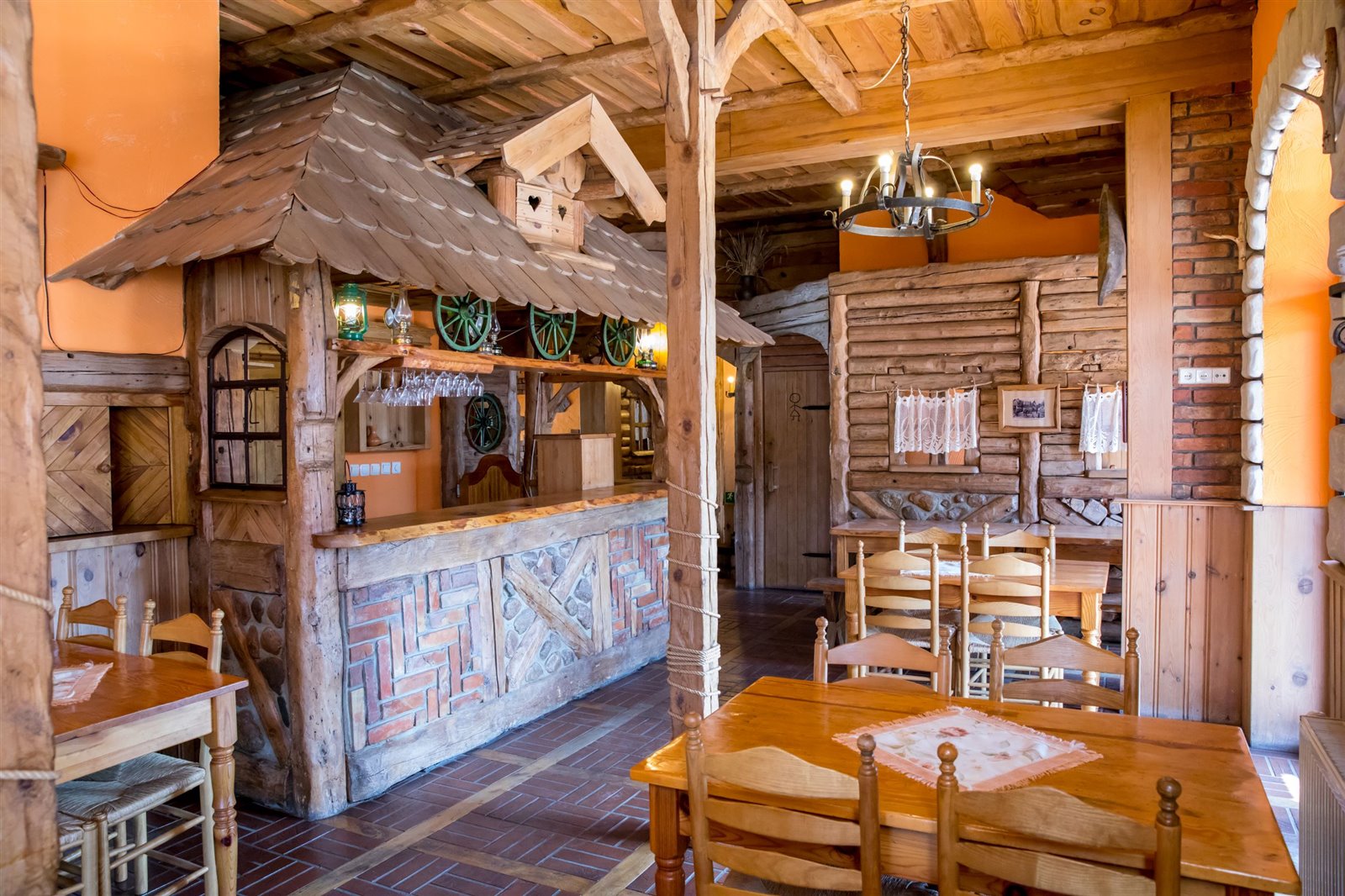 2 sale jadalne o powierzchni około 61 m2, połączone drewnianym barem, robionym na wzór Mazurskiej Chaty; sale są wyposażone w 9 stołów i 36 krzeseł; z większej sali wychodzi się na otaczający budynek taras widokowy, który z sukcesem służył jako letni ogródek z 5 stołami i 10 ławami.