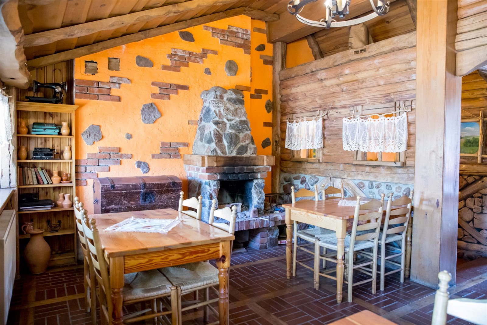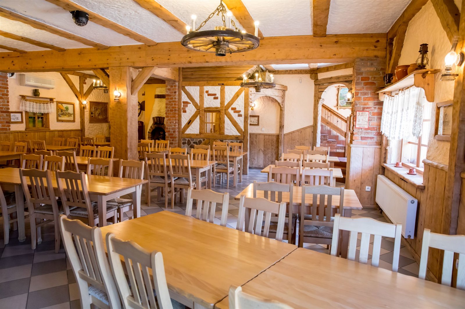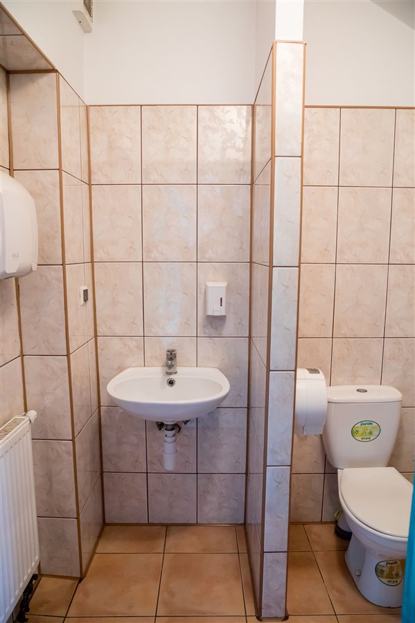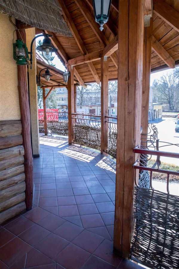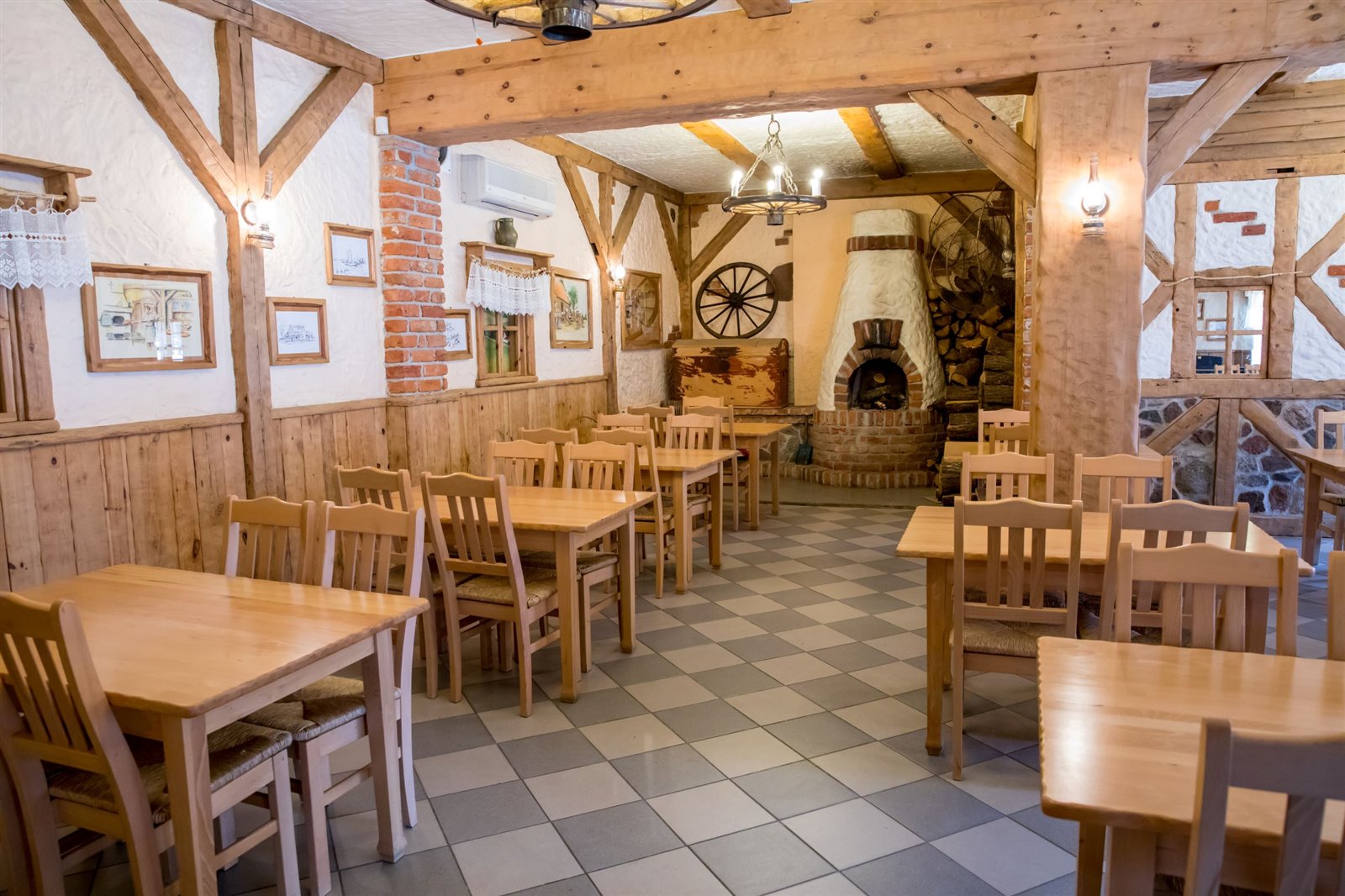widna, przestronna sala jadalna o powierzchni około 82,7 m2, wyposażona w 15 stołów i 60 krzeseł, łazienka, bar, kominek, toaleta.