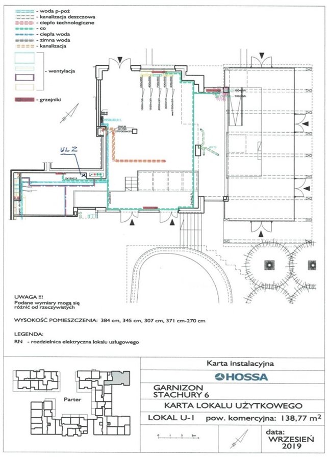 Lokal o powierzchni 138,77 m2 + 74,11 m2 szklanej konstrukcji, składa się z trzech części: