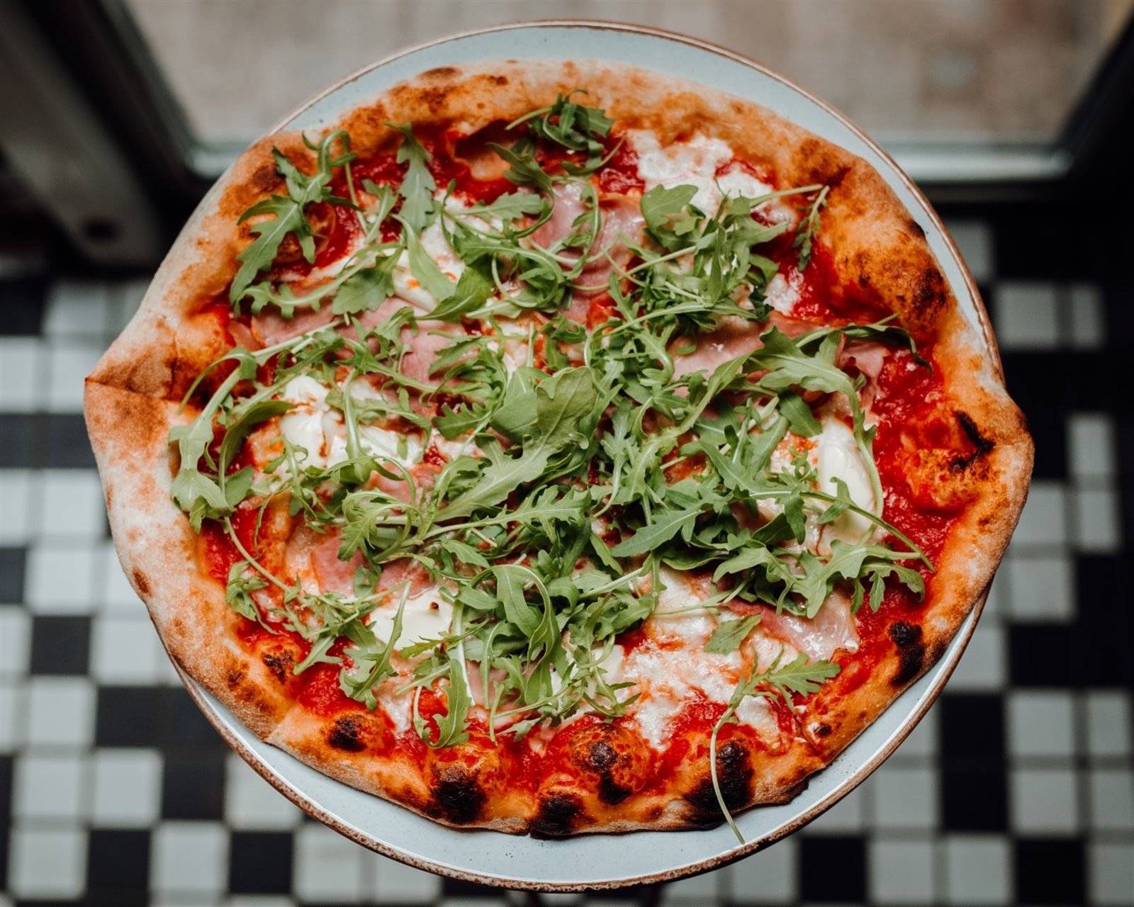 • Parter: sala restauracyjna, bar, kuchnia z przeszkloną częścią (widoczne dwa piece do pizzy), chłodnia