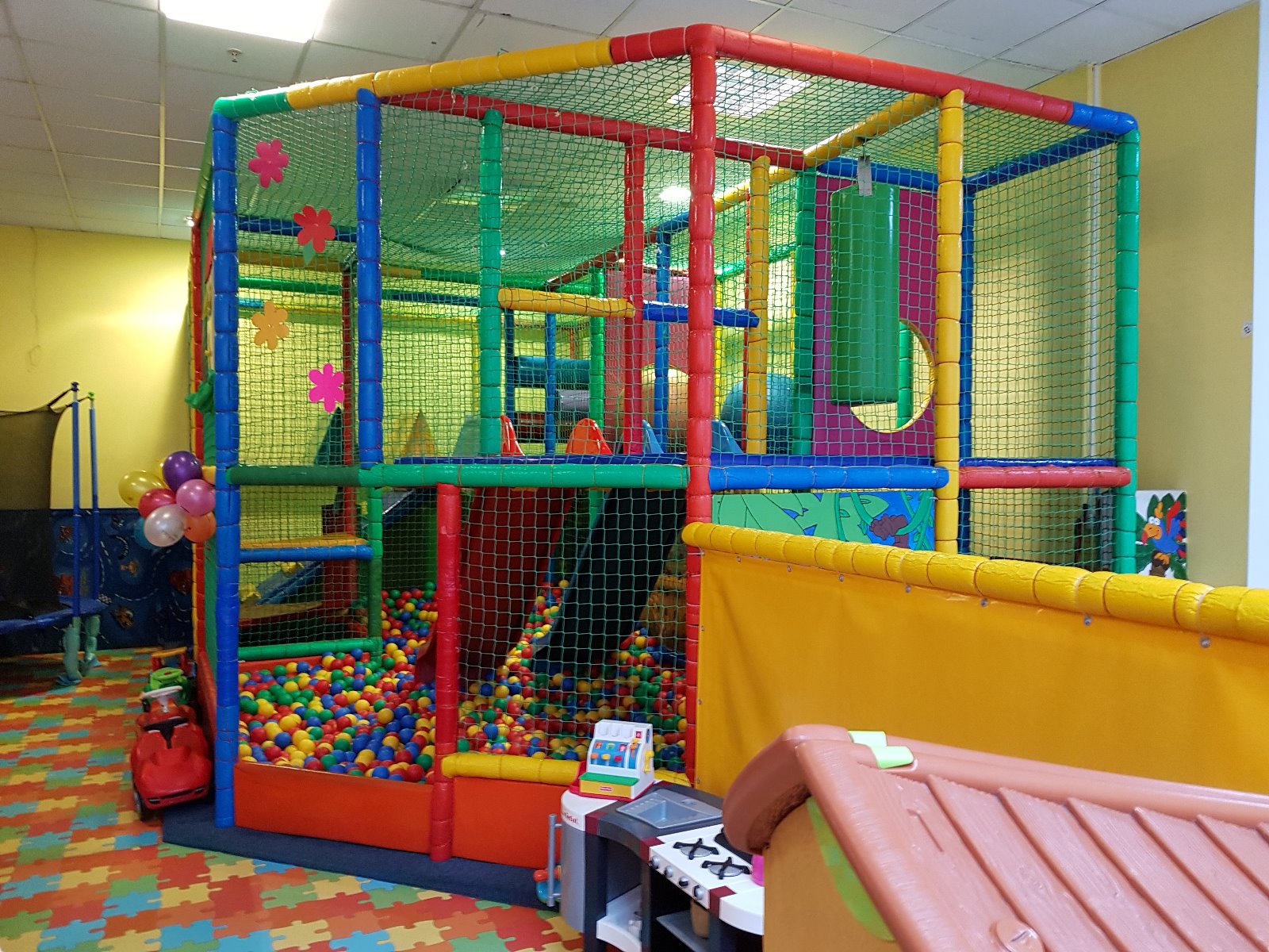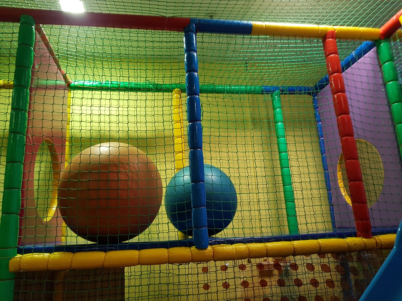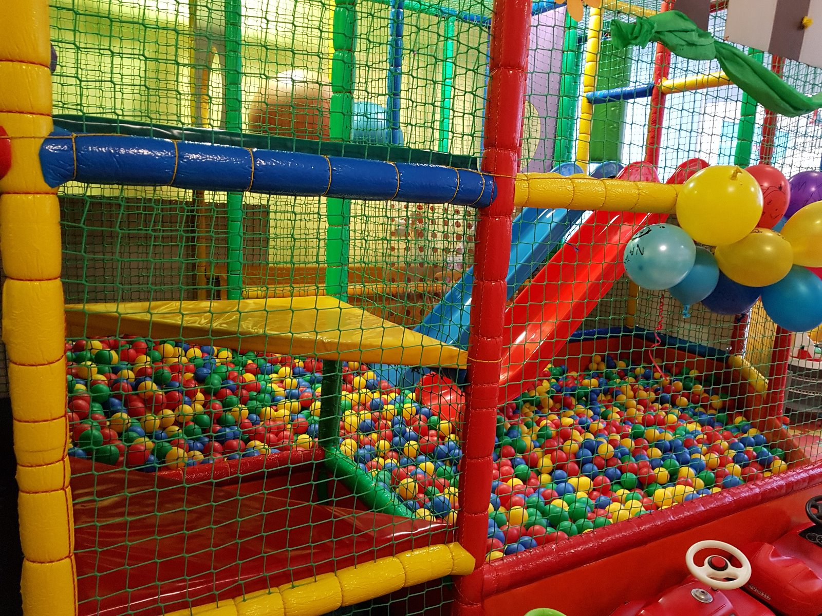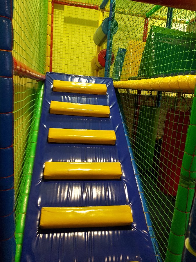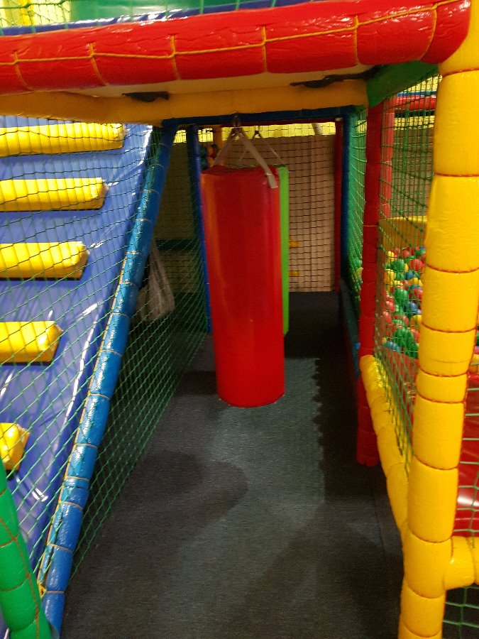 - 25 metrów kwadratowych konstrukcji dwupoziomowej - wiszące przeszkody, obrotowy wałek, basen z 10 000 kulek) podwójna zjeżdżalnia i inne,