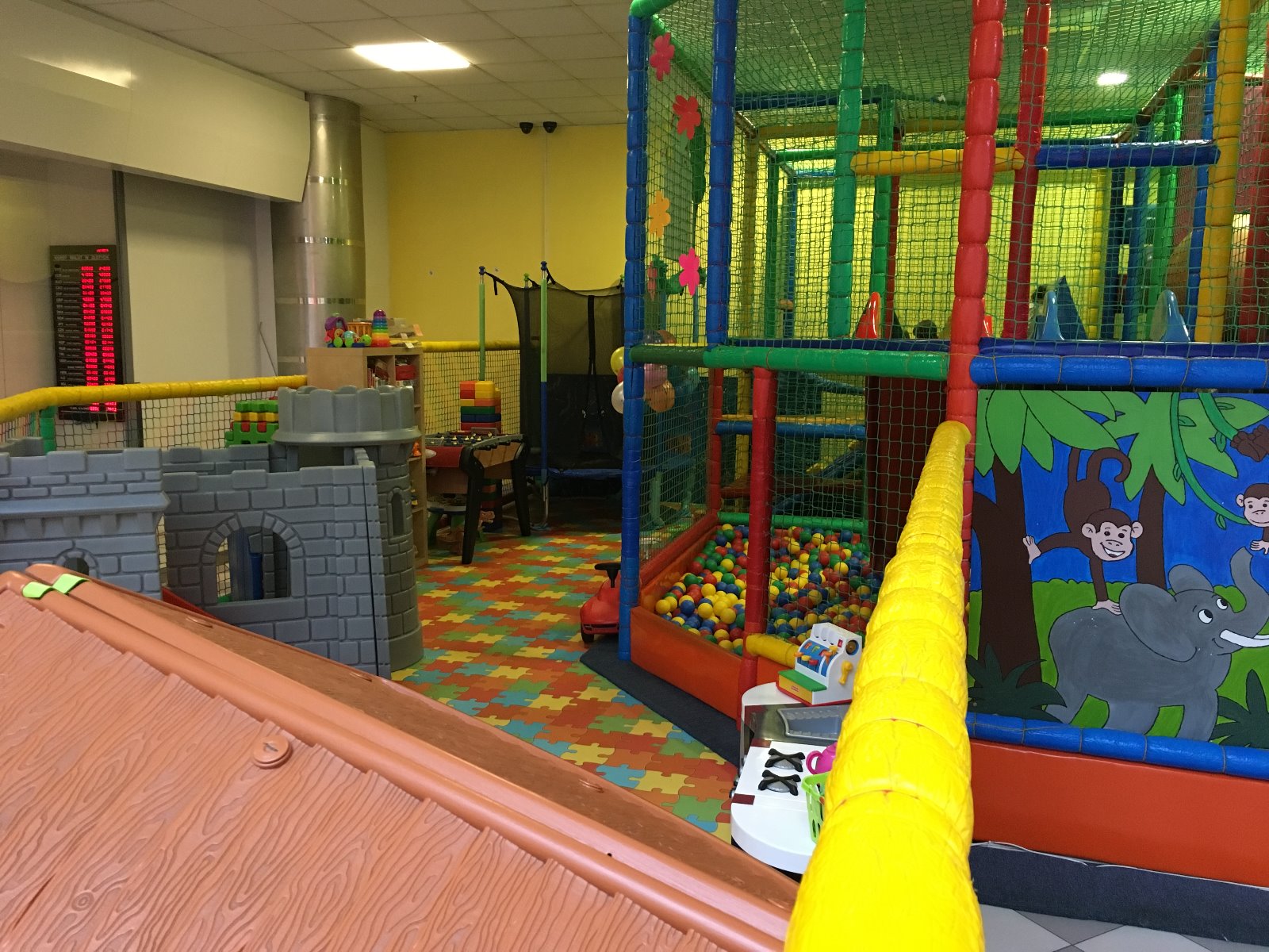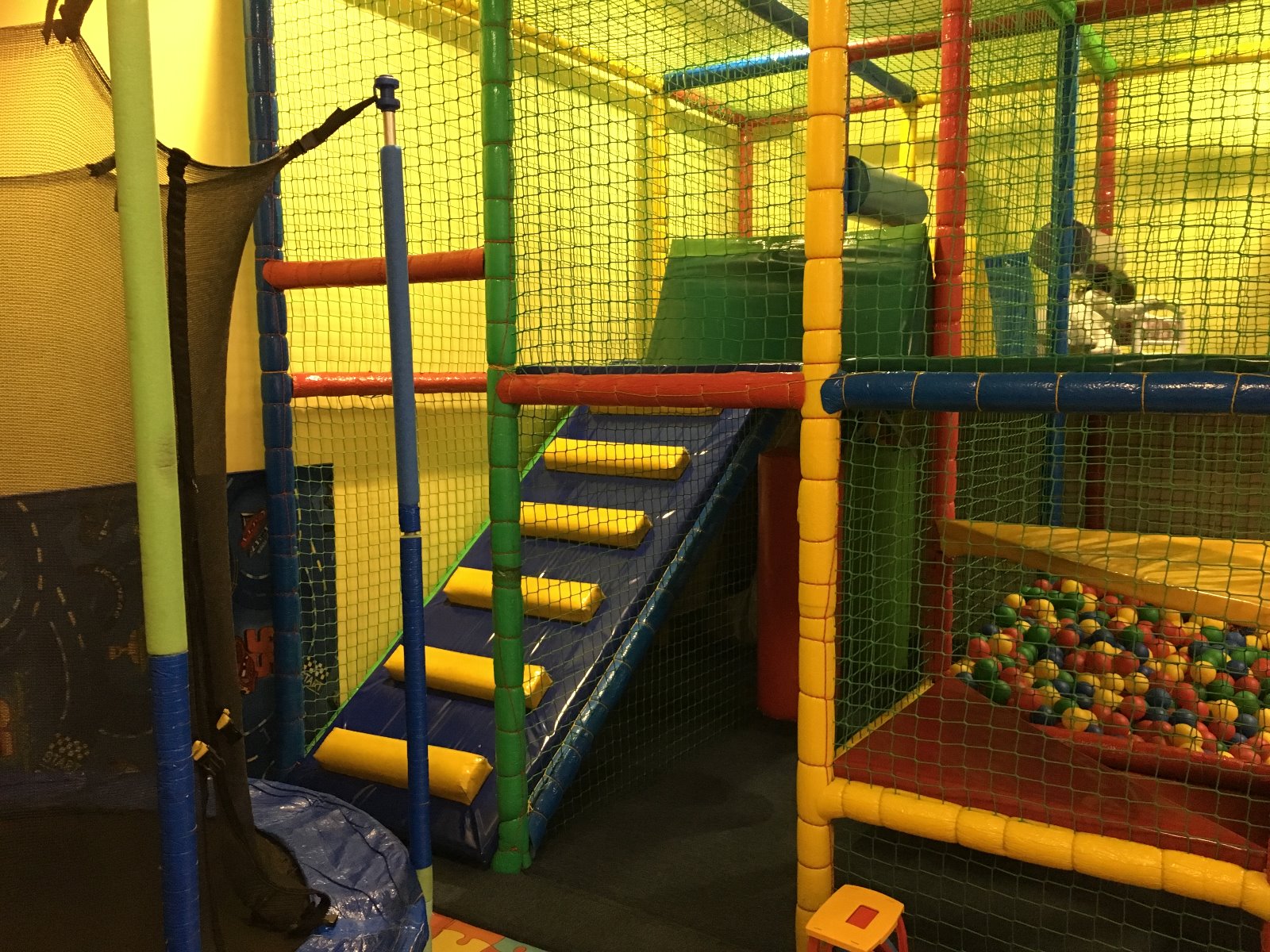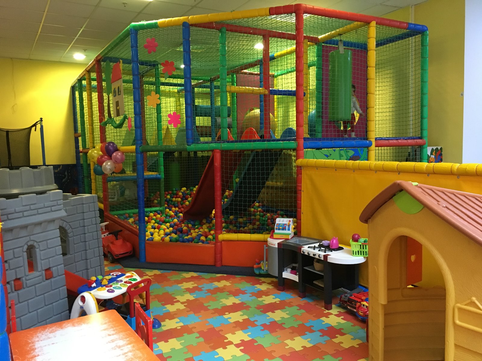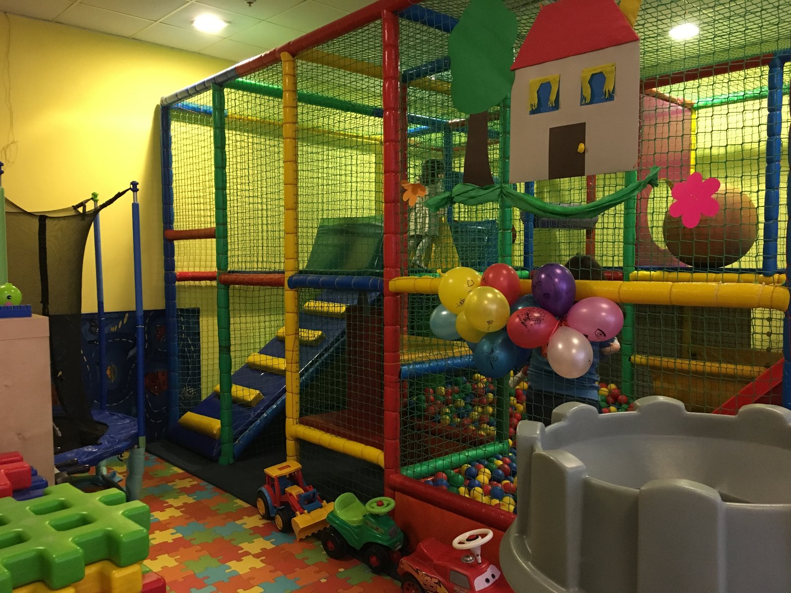- 25 metrów kwadratowych konstrukcji dwupoziomowej - wiszące przeszkody, obrotowy wałek, basen z 10 000 kulek) podwójna zjeżdżalnia i inne,