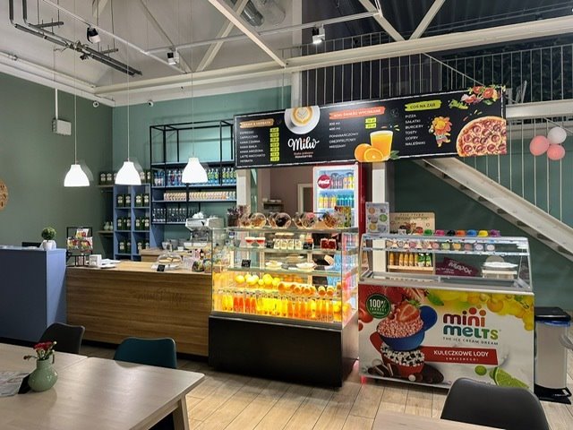 W pełni wyposażona kawiarnia, wraz z antresolą daje możliwość organizowania imprez okolicznościowych z wydzieleniem strefy prywatnej.