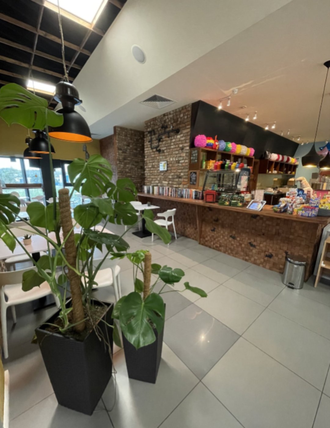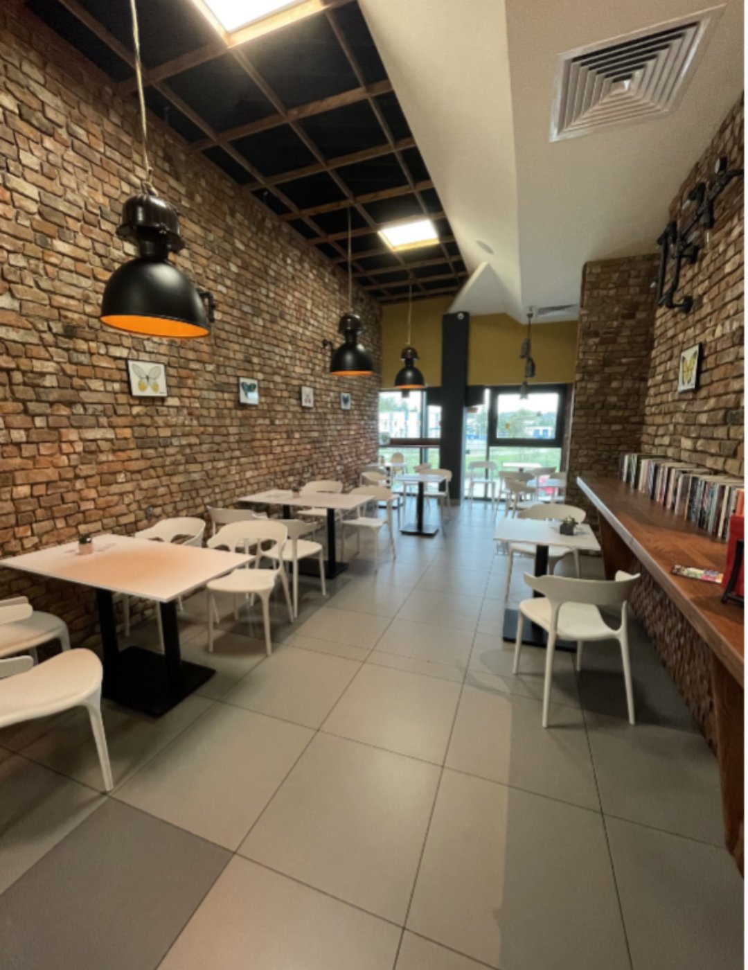 Klimatyczna kawiarnia wyposażona w biało-czarne stoły oraz wygodne krzesła. Na ścianach położona surowa cegła. Miejsca siedzące przy barze, kącik czytelniczy oraz miejsce przygotowane pod scenę z reflektorami i wieszakiem na telewizor.