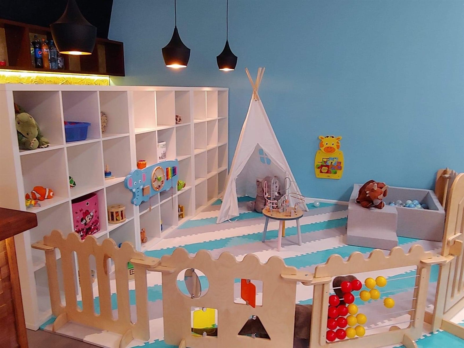 STREFA MALUCHA - Oddzielona drewnianym, sensorycznym płotkiem. Przystosowana pod najmłodszych, raczkujących gości. Podłoże wyłożone miękkimi piankami podłogowymi.