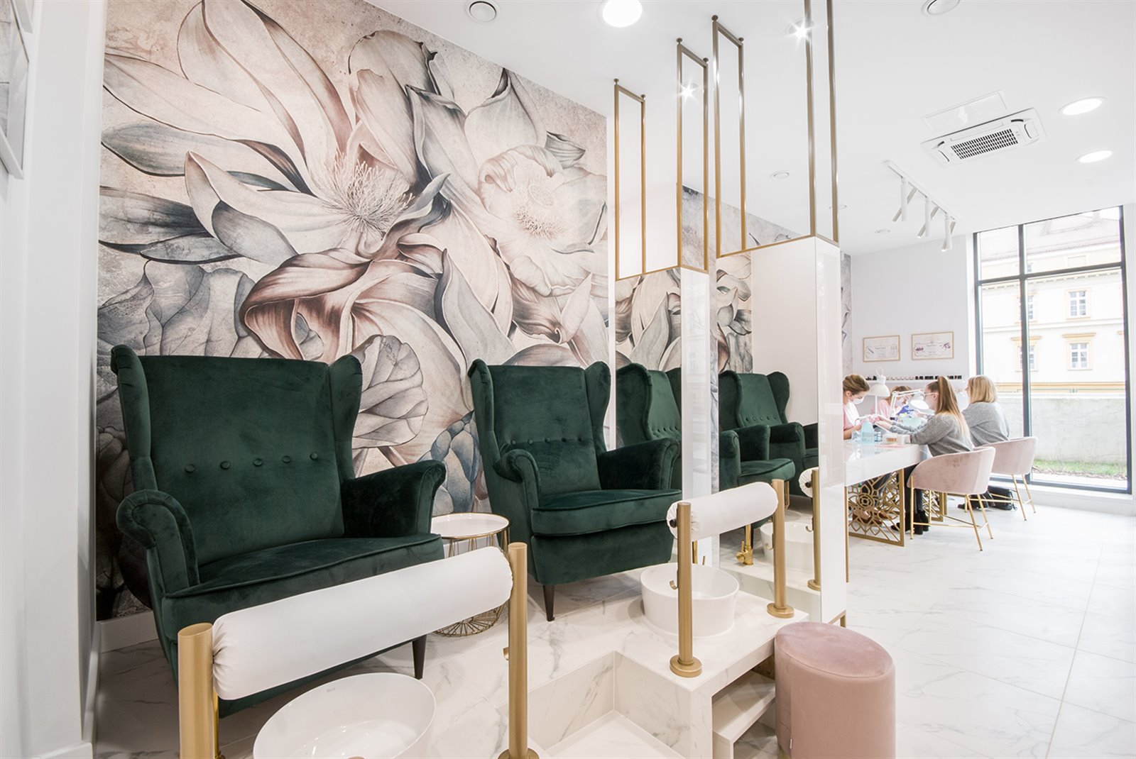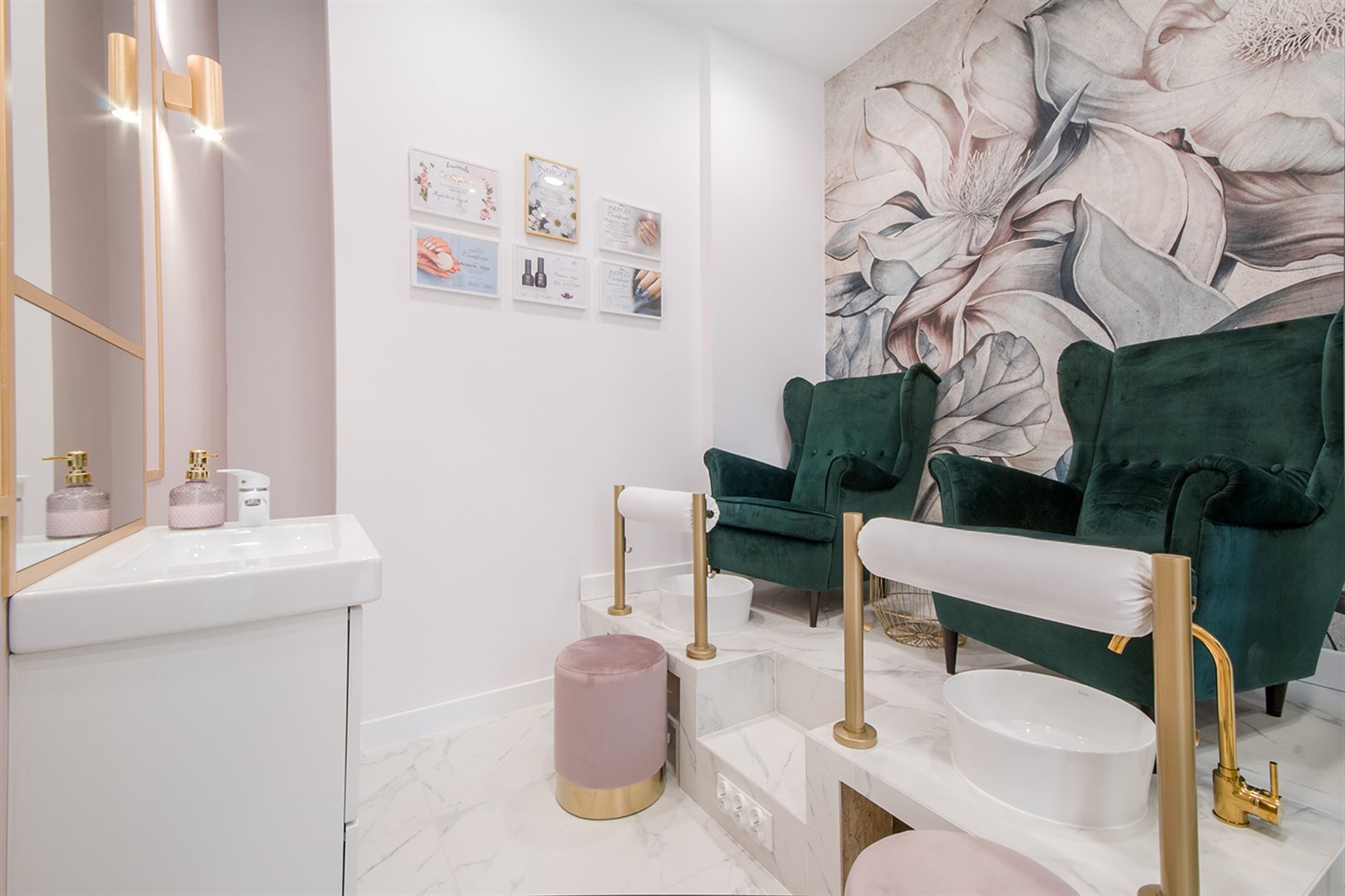- open space z 3 stanowiskami do manicure, 2 stanowiskami do pedicure, stanowisko do wizażu,