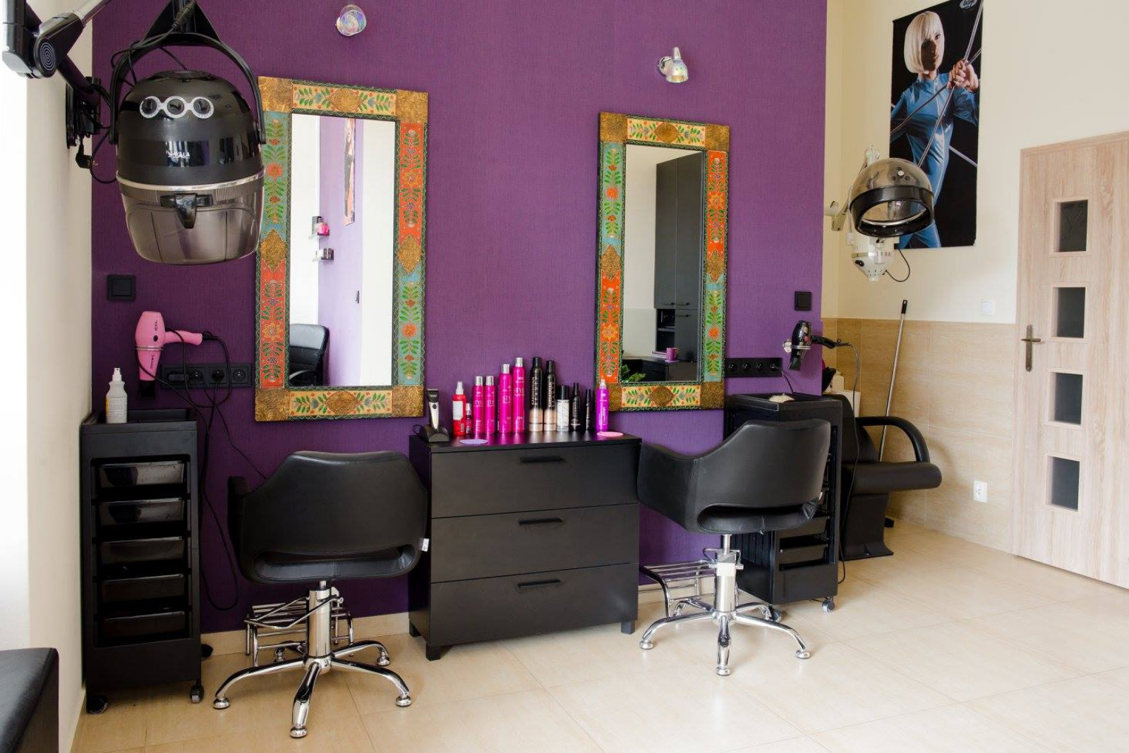 - dwa stanowiska fryzjerskie i myjka,