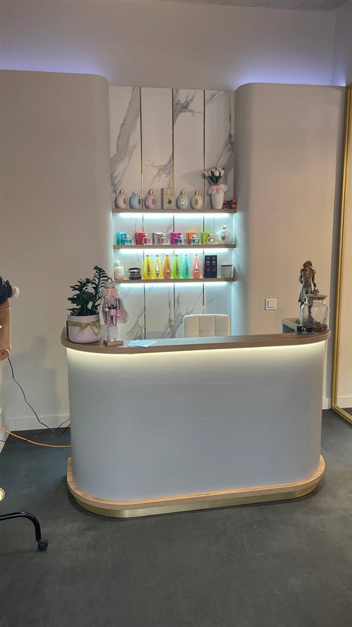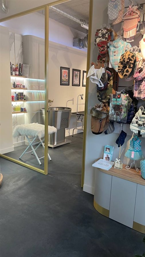 1) Recepcja - wyposażona w ekskluzywne meble najwyższej jakości (stół, szafki, wieszaki dla psów) oraz dużą lustro. Wszystko zostało zaprojektowane i wykonane na zamówienie. (W salonie pozostaje cały towar: odzież dla psów, szelki, kosmetyki IV San Bernard, które są na sprzedaż).