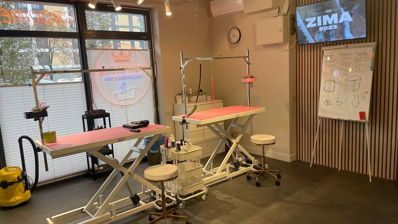 Pracownia wyposażona w wygodne elektryczne stoły do pracy, konsole, szafki, krzesła dla groomerów, strefę oczekiwania dla psów, smart TV z dużym ekranem, a także profesjonalne wyposażenie groomerskie (bezprzewodowe maszynki, nożyczki, ostrza, szczotki, grzebienie i inne). Jedną z największych zalet jest system SPA i wanna do ozonoterapii od najlepszej na rynku włoskiej marki IV San Bernard do terapeutycznej i pielęgnacyjnej ozonoterapii. Pracownia została zaprojektowana tak, aby była również możliwość organizacji szkoleń/seminarów. Z naszego doświadczenia pomieści do 25 osób.