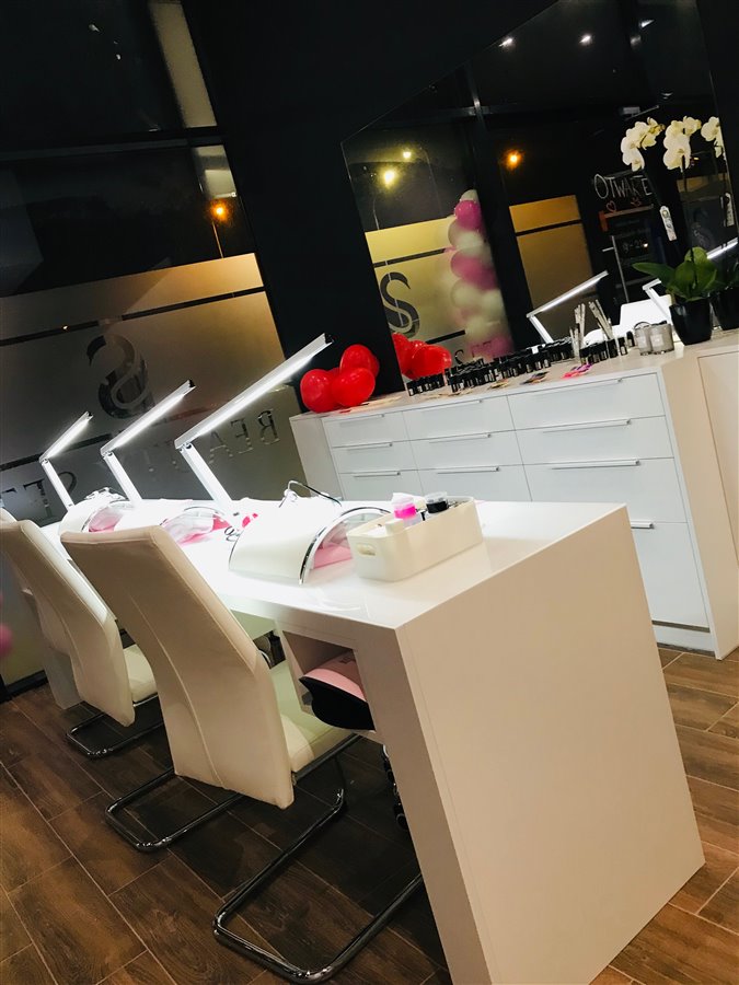 Z części głównej - manicure, podest na stanowiska pedicure, poczekalnia, stanowisko wizaż,