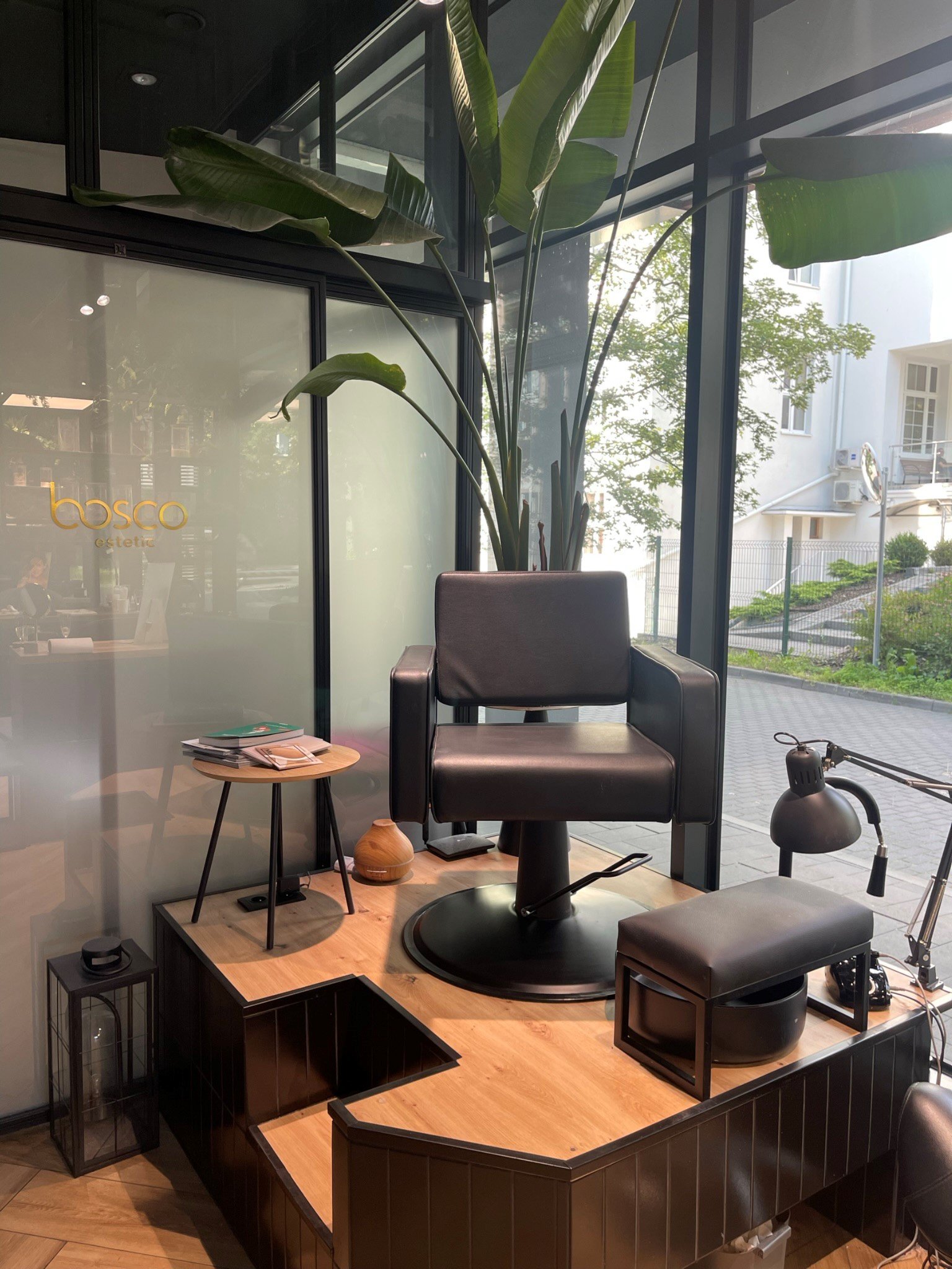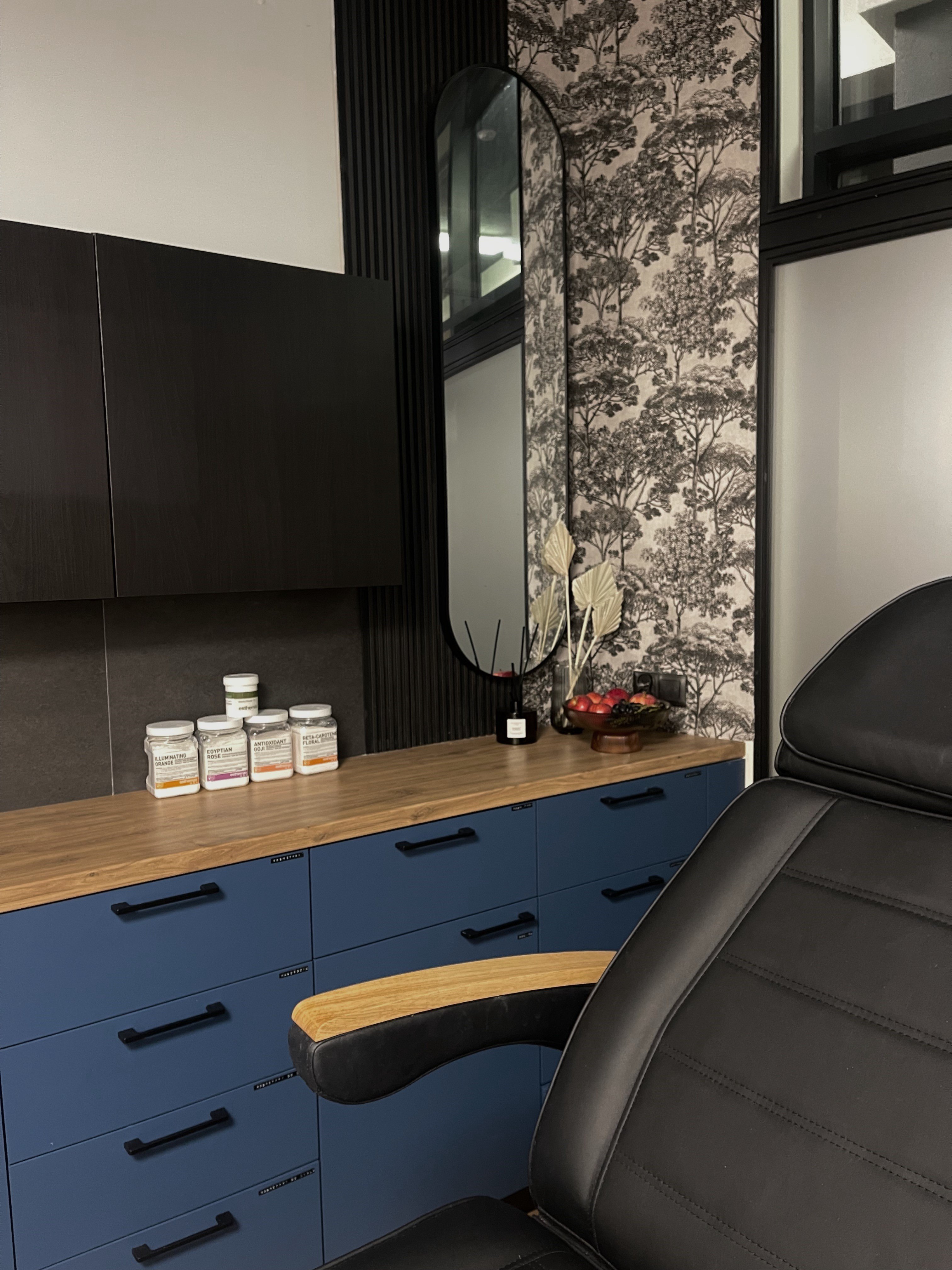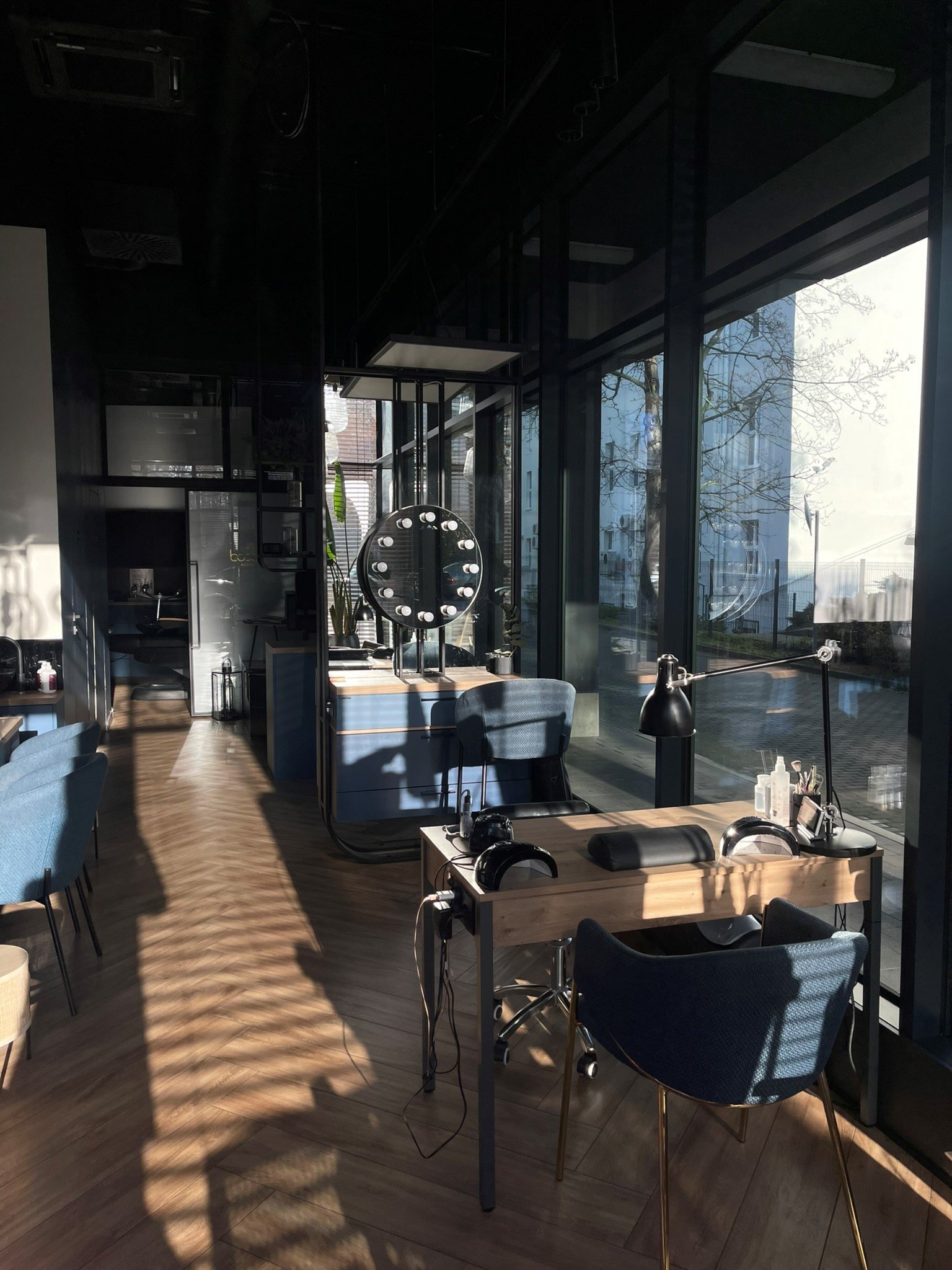 Osobny przeszklony gabinet w którym można wykonywać zabiegi kosmetyczne, stylizacje rzęs, makijaż permanentny, szkolenia, zabiegi z zakresu medycyny estetycznej. Na specjalne zamówienie została wykonana narożna zabudowa loftowa ze stali, szkłem hartowanym i przesuwnymi drzwiami. Szyby zostały pokryte białą matową folią tak by