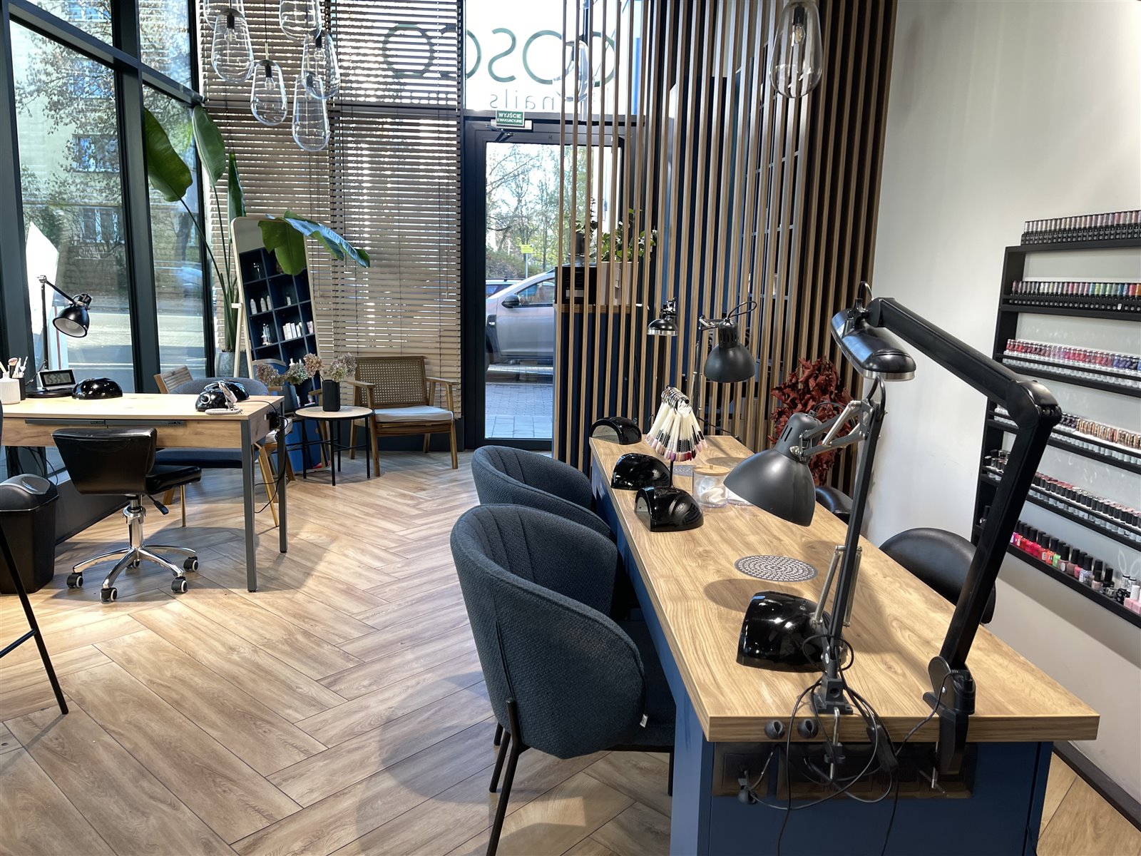 Łazienkę i pomieszczenie socjalne. W studiu jest wydzielone miejsce na recepcję zaprojektowaną z pełną zabudową oraz poczekanie dla klientów. Na przednich szybach zostały zamontowane nowoczesne drewniane żaluzje.