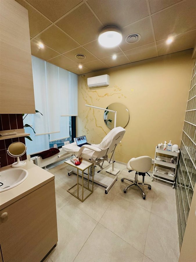 Lokal o powierzchni 123 m², dwupoziomowy, zaprojektowany przez architekta wnętrz i w pełni dostosowany do działalności kosmetologicznej oraz medycyny estetycznej.