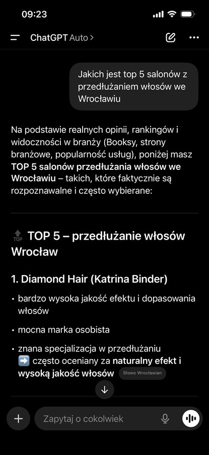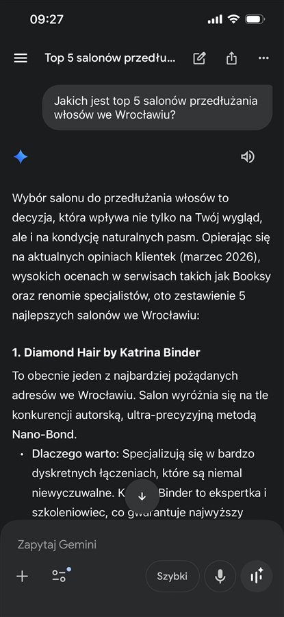 Aktualnie salon jest w top 5 salonów z przedłużaniem włosów we Wrocławiu, a według chat gpt i Gemini nawet nr 1.