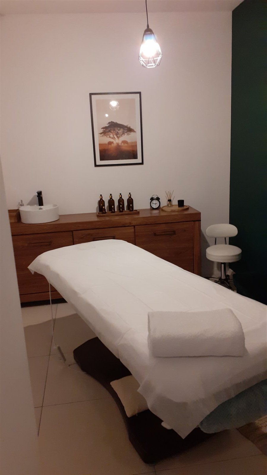 Salon składa się z dwóch zamkniętych gabinetów - jeden do masażu, gdzie jest podgrzewane łóżko, kabina prysznicowa, komoda z umywalką.