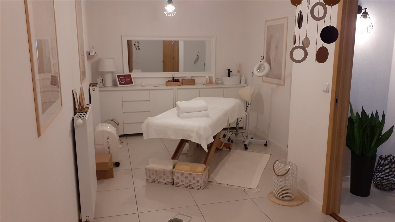 Drugi to gabinet kosmetyczny, a w nim: komody z umywalką, podgrzewane łóżko, stolik z krzesłami do relaksu po zabiegu, maszyny oryginalne intraceutikals i dermapen.