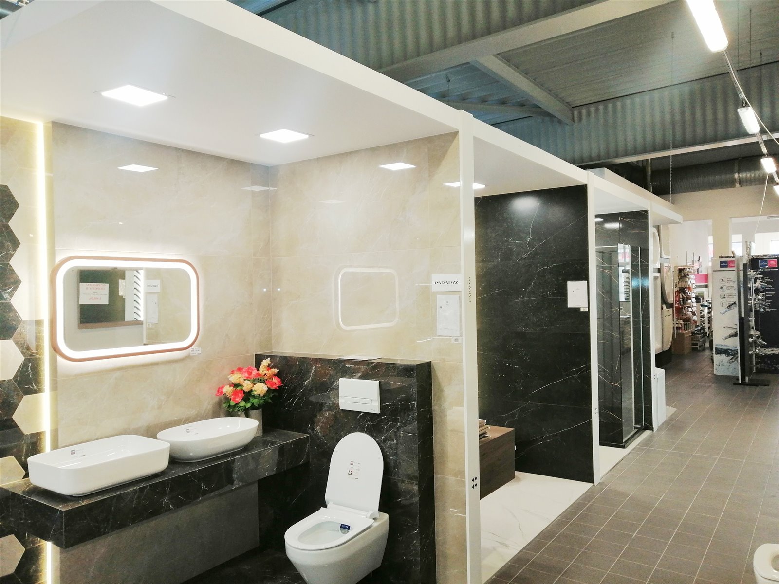 Działamy w tym miejscu od 15 lat. Zajmujemy lokal o powierzchni 535 m2 (powierzchnia handlowa, magazynowa wraz z zapleczem sanitarnym). Całe wnętrze wykonane jest w wysokim standardzie (boksy łazienkowe, ekspozytory producentów).