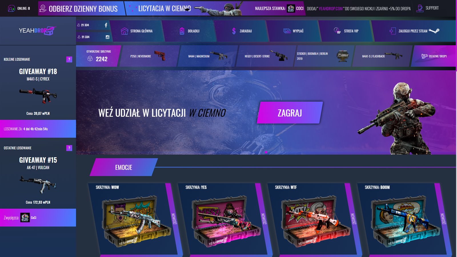 posiadamy na sprzedaż w pełni zautomatyzowaną platformę gamingową typu "Open Case" napisaną od podstaw. Serwis posiada dodatkowe opcje, np. Licytację w ciemno, wszelkie bonusy dzienne, giveaway i tym podobne.