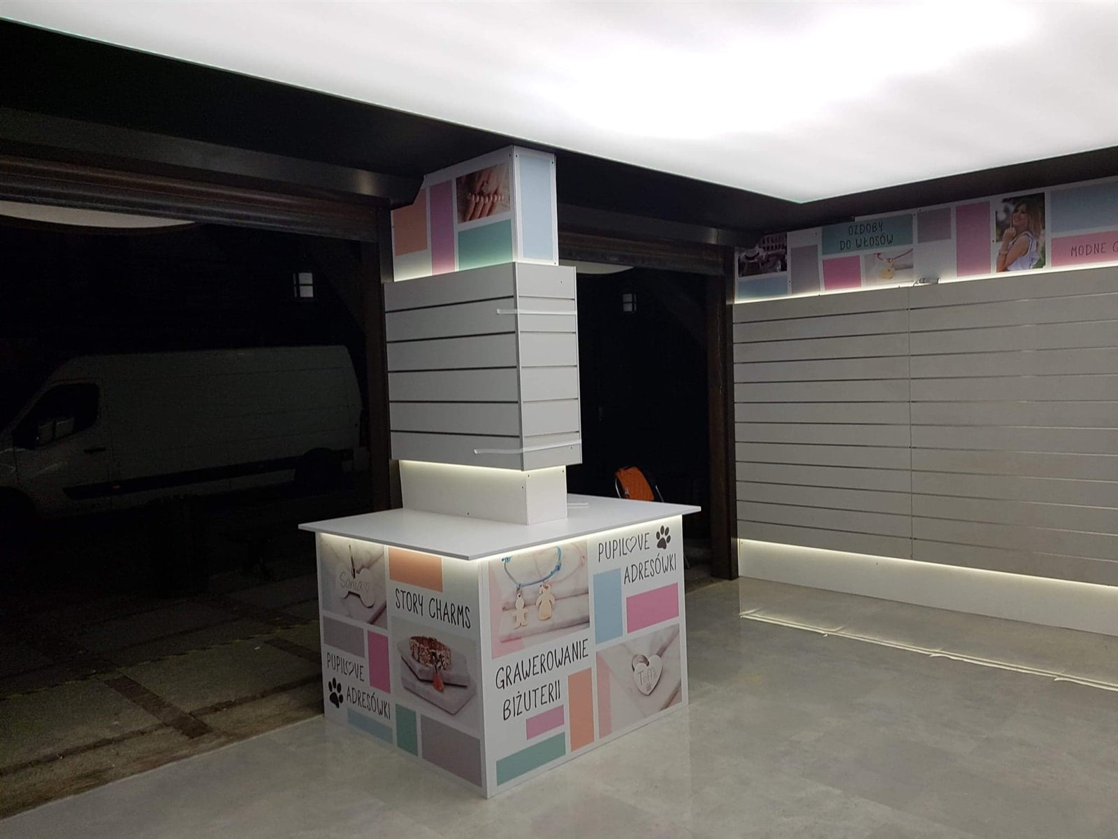 Wyposażone w oświetlenie, kafle/ wykładziny, kamery z podglądem w telefonie, meble, rolety zewnętrzne, systemy ekspozycyjne space wall z hakami, część z punktów posiada noclegi dla osób zajmujących się sprzedażą.