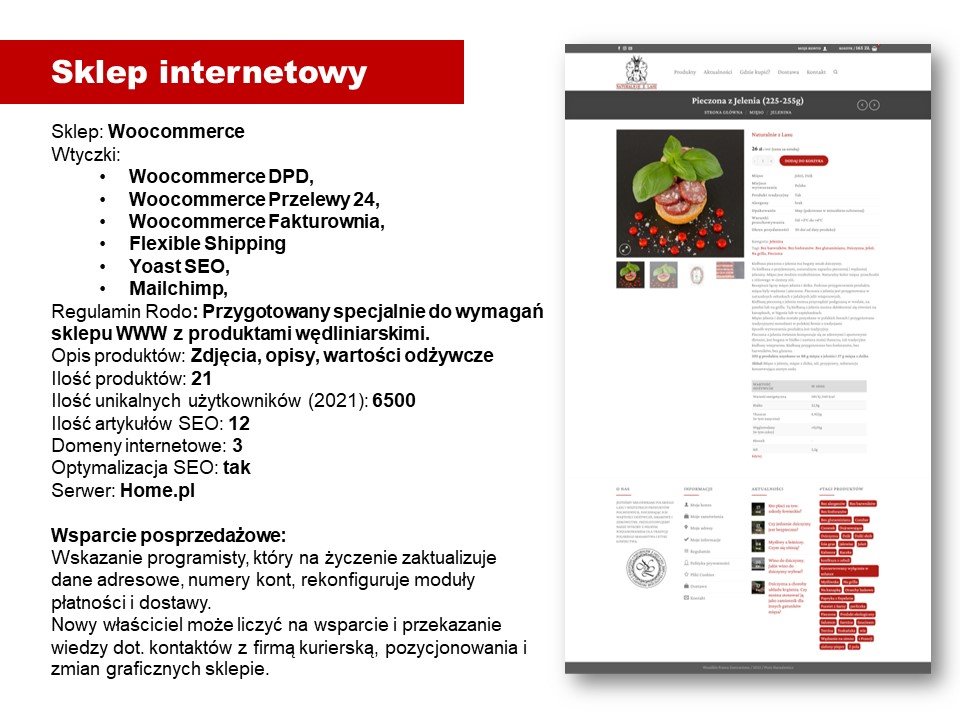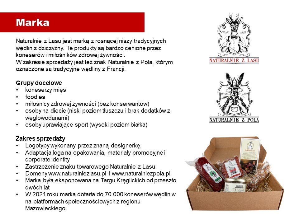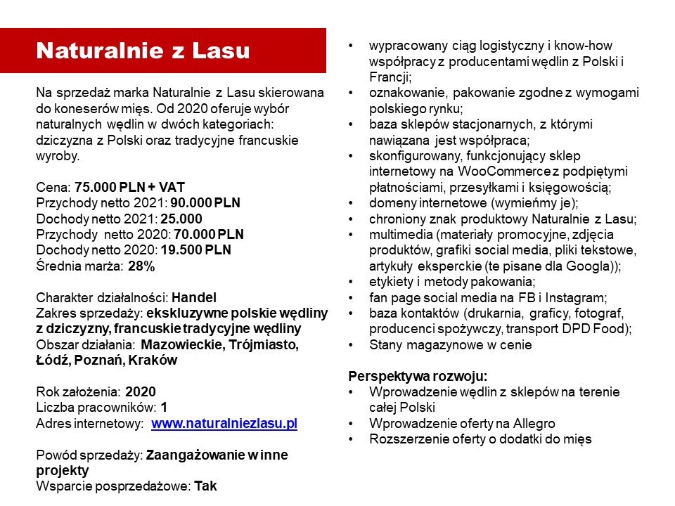 Z uwagi na konieczność zajęcia się innym (głównym) biznesem zdecydowałem się wystawić na sprzedaż projekt związany z dystrybucją ekskluzywnych wyrobów z dziczyzny. Jest to sklep internetowy – ustawiony, świetnie działający, z dystrybucją (w systemie chłodzonym) w kilku największych miastach Polski. Oprócz tego sprzedaż na rynku tradycyjnym, w ekskluzywnych sklepach i restauracjach. Marka własna z zarejestrowanym brandem i pięknym logiem. Historia w mediach społecznościowych, świetne zdjęcia produktowe, naklejki zbierające bardzo dobre opinie. Kilka domen, wysoka rozpoznawalność przez Google dzięki artykułom branżowym.