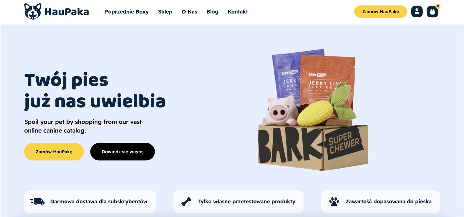 Na sprzedaż sklep internetowy HauPaka.pl oferujący comiesięczne boxy subskrypcyjne dla psów zawierające przysmaki i zabawki. Benchmark: barkbox.com.