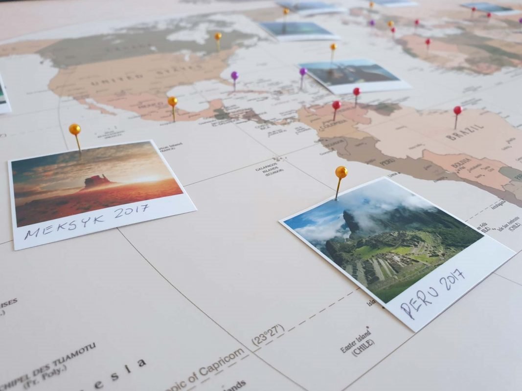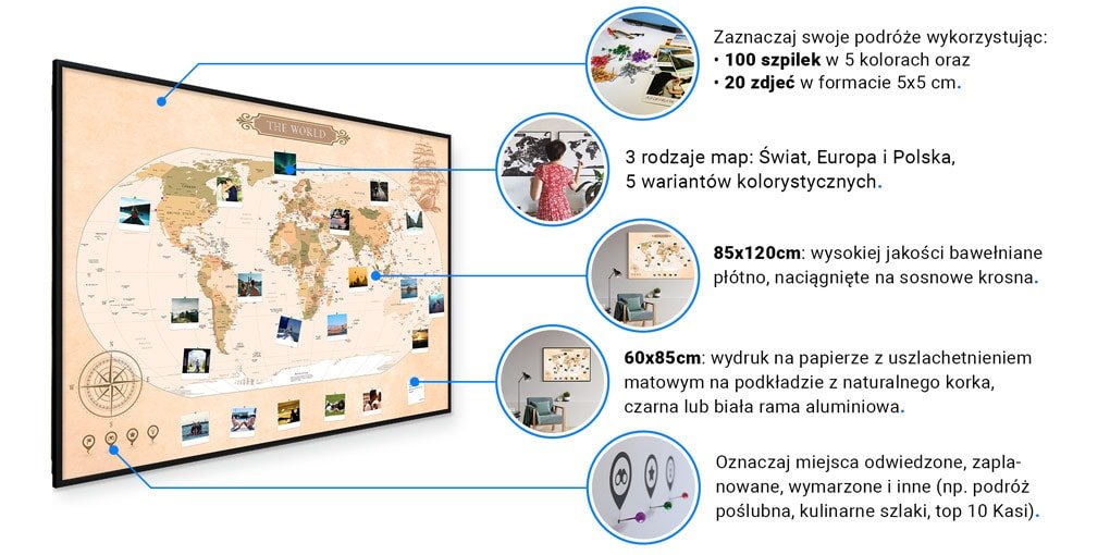 • Personalizowane mapy podróży (Świat, EU i PL w 5 kolorach)