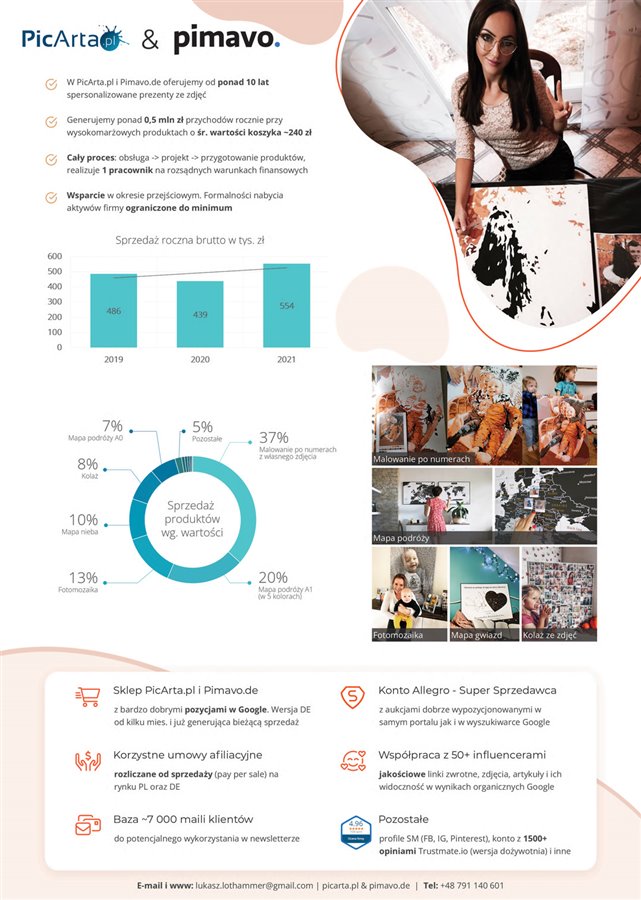 Firma świadczy usługi w niszy personalizowanych prezentów ze zdjęć i mamy na sprzedaż 2 sklepy internetowe generujące ponad 0,5 mln zł przychodów rocznie przy wysokomarżowych produktach o średniej wartości koszyka ~240 zł .