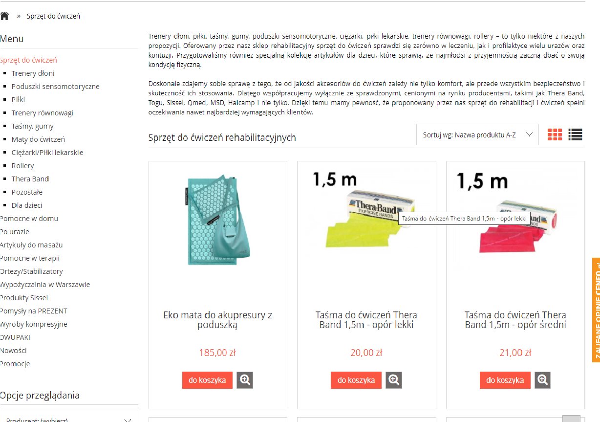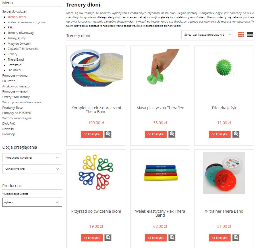 W asortymencie znajdują się ponad 400 opisanych produktów m.in. drobny sprzęt do ćwiczeń, poduszki ortopedyczne do siedzenia i do spania, ortezy, wózki, chodziki, kule ortopedyczne, art, kompresyjne, art. łazienkowe i toaletowe, wkładki ortopedyczne.