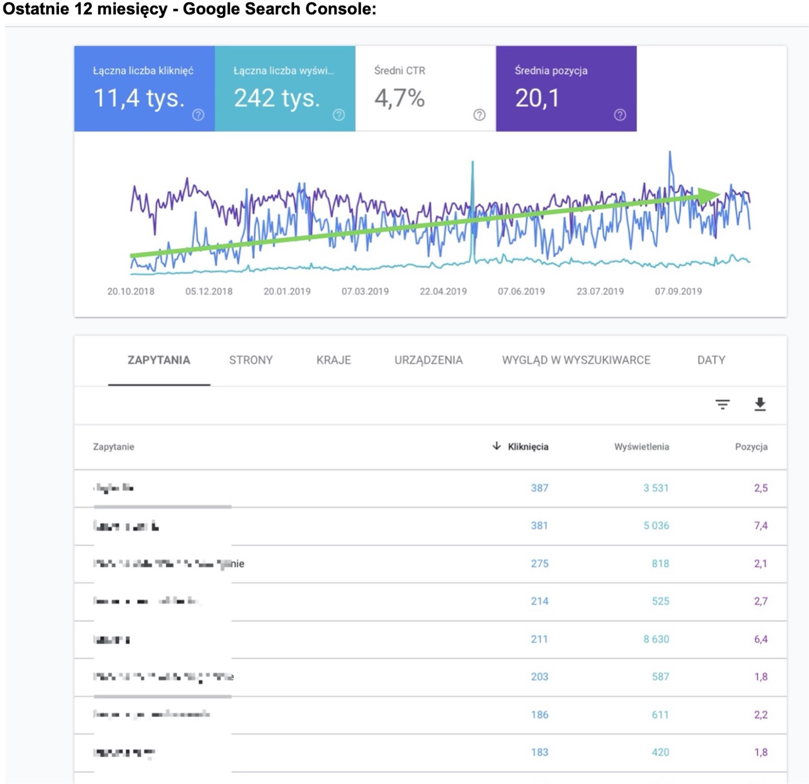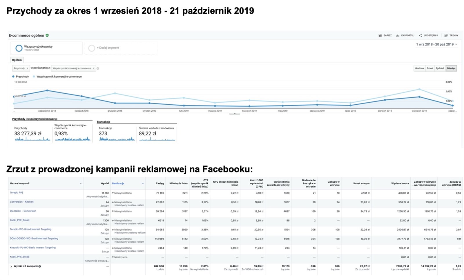 Więcej informacji (zrzuty z Google Analytics, Google Search Console, Reklamy Facebook, wygląd sklepu: