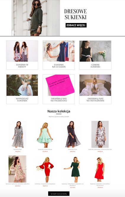 Sklep działa na zasadzie dropshippingu. Współpracujemy z sześcioma najlepszymi polskimi producentami odzieży damskiej. W asortymencie sklepu znajdują się sukienki: wieczorowe, sportowe, na wesele czy na co dzień. W przyszłości można rozwinąć asortyment.
