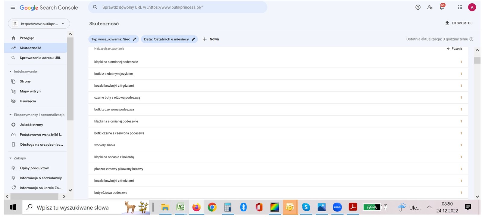 Widoczność w Google Search Console na 950 słów kluczowych w Top50, w Top3 - 226 za ostatnie 6 miesięcy.
