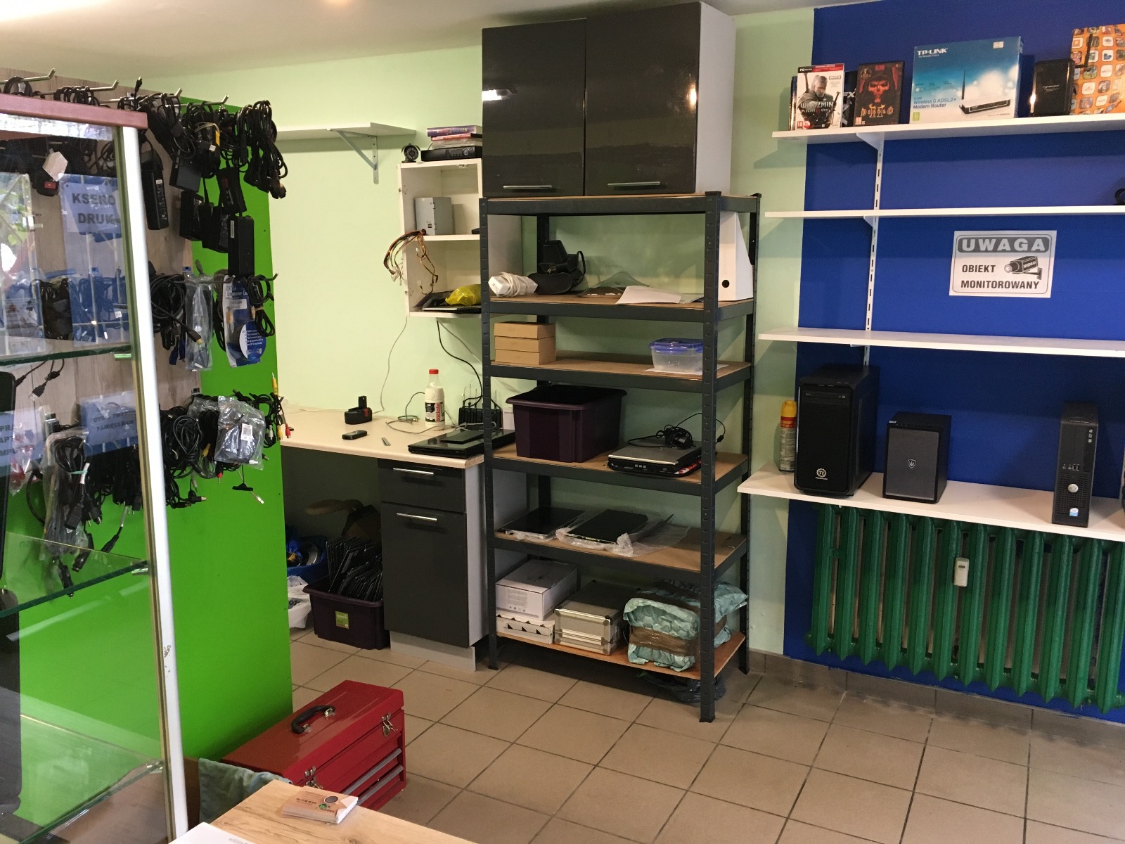 Na wyposażeniu sporo części do laptopów i komputerów, CPU, WIFI, klawiatury, kable itp.
