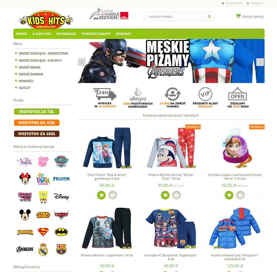 Na sprzedaż sklep internetowy z licencjonowaną odzieżą dla dzieci. Działalność przez lata nieprzerwanie funkcjonowała, przez co zyskała tysiące zadowolonych Klientów, zaufanie oraz rozpoznawalność rynkową. Sklep w szczególności zajmuje się sprzedażą wysyłkową oryginalnej i licencjonowanej odzieży dla dzieci. Oferuje przedmioty z logiem: Star Wars, Kraina Lodu, Disney, Auta, Psi Patrol, Spiderman, Violetta, Świnka Peppa, FC Barcelona itp.