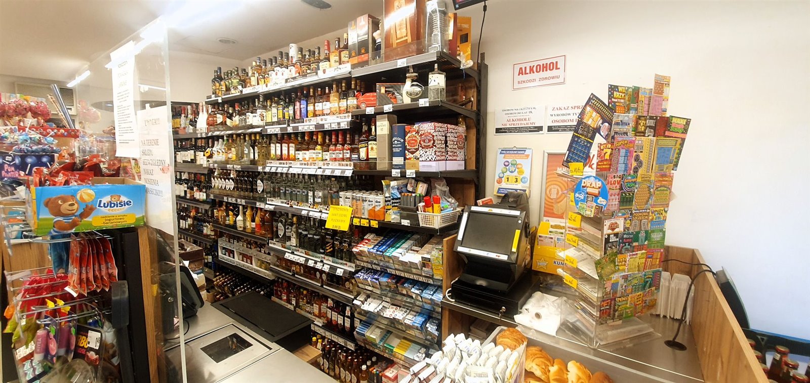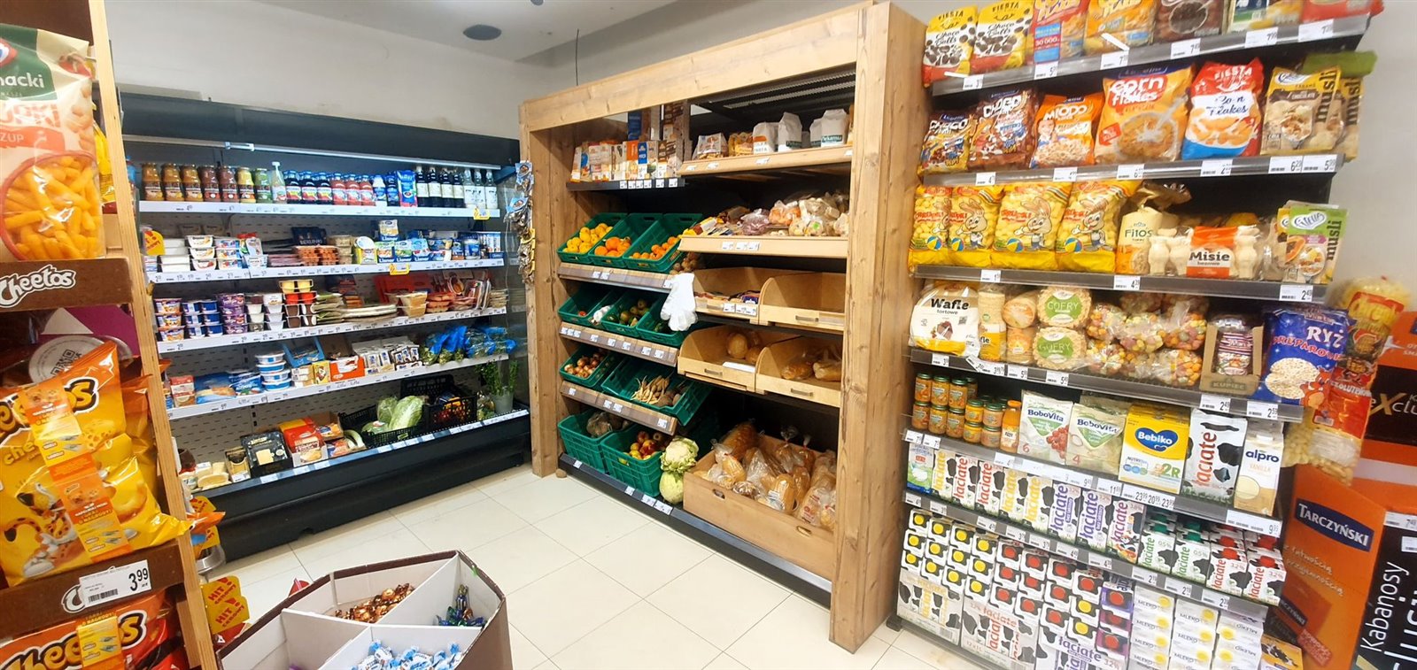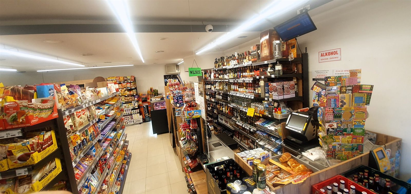 Sklep ma format samoobsługowy z tradycyjną ladą mięsną i wędliniarską, posiada lotto, orlen paczkę , a przed sklepem Inspost i bardzo duży parking na kilkanaście aut.