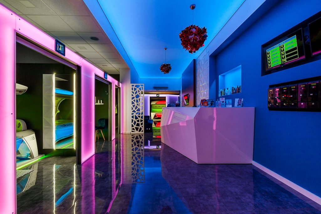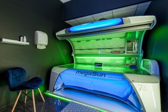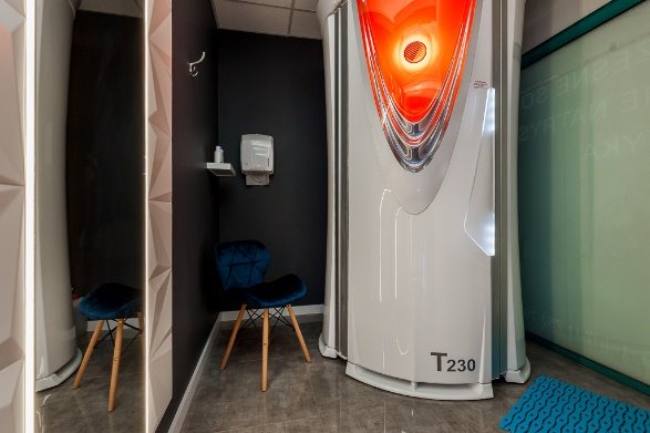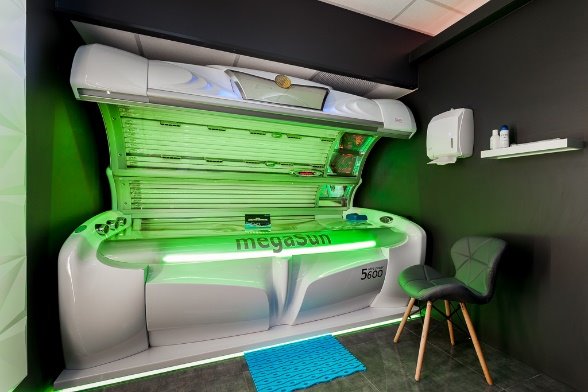 1. SOLARIUM - 7 w pełni wyposażonych kabin do opalania. W każdej znajduje się duże podświetlane lustro, półka, podajnik papieru, wieszak, kosz na śmieci, krzesło oraz łóżko do opalania firmy megaSun ustawione na podświetlanym podeście. Kabiny zamykane są na elektryczne białe rolety, nad każdą z nich zamontowany jest tablet informacyjny.