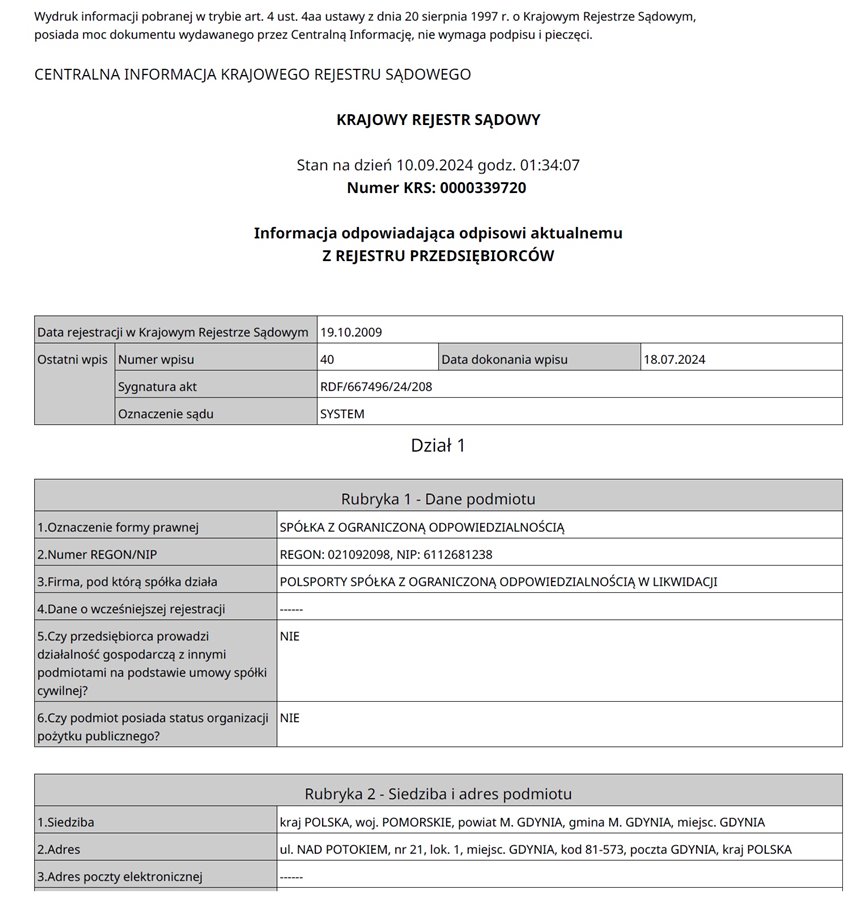 • Księgowość: Czysta i aktualna. Spółka składała zerowe sprawozdania finansowe od 2019 roku i nie generowała obrotów.