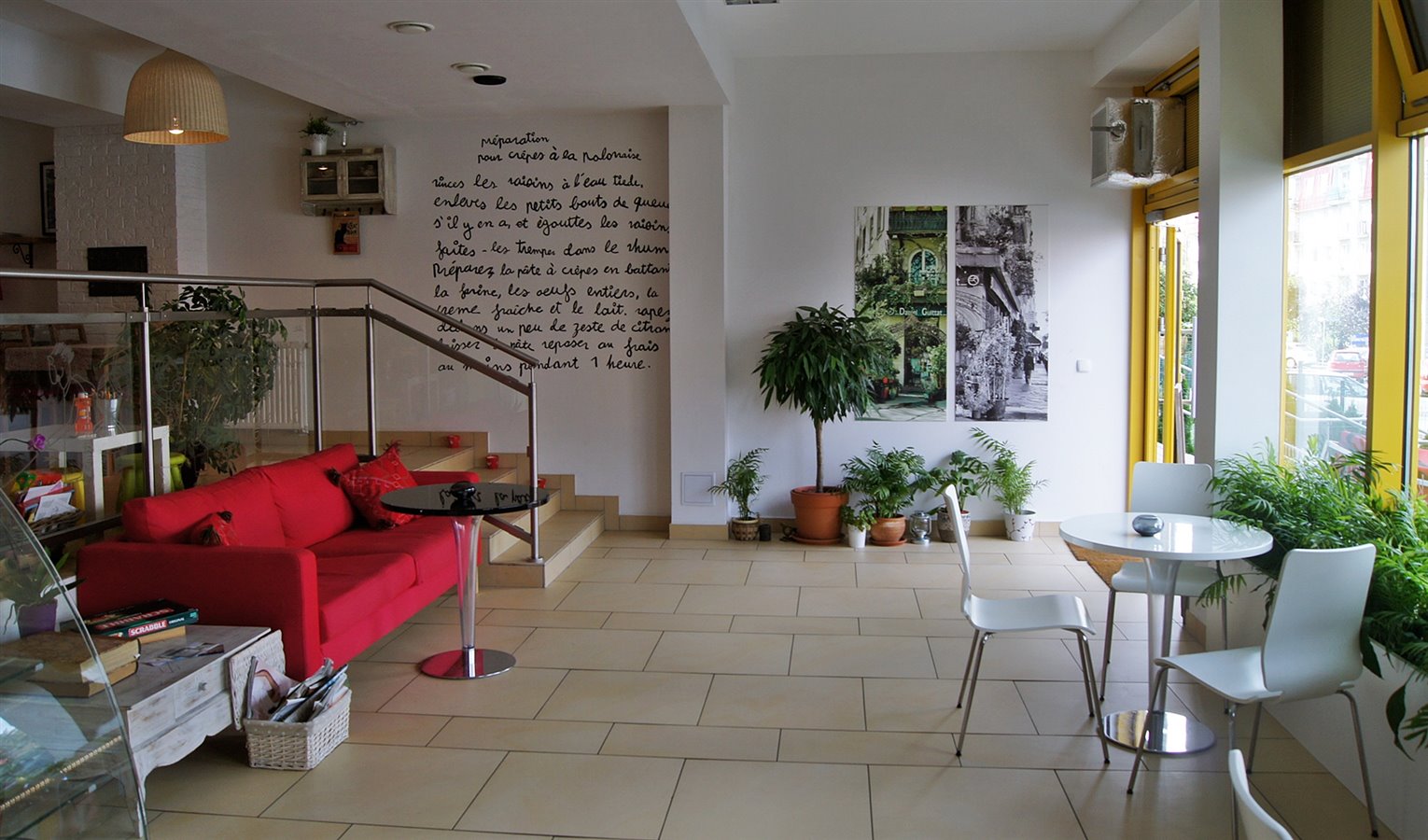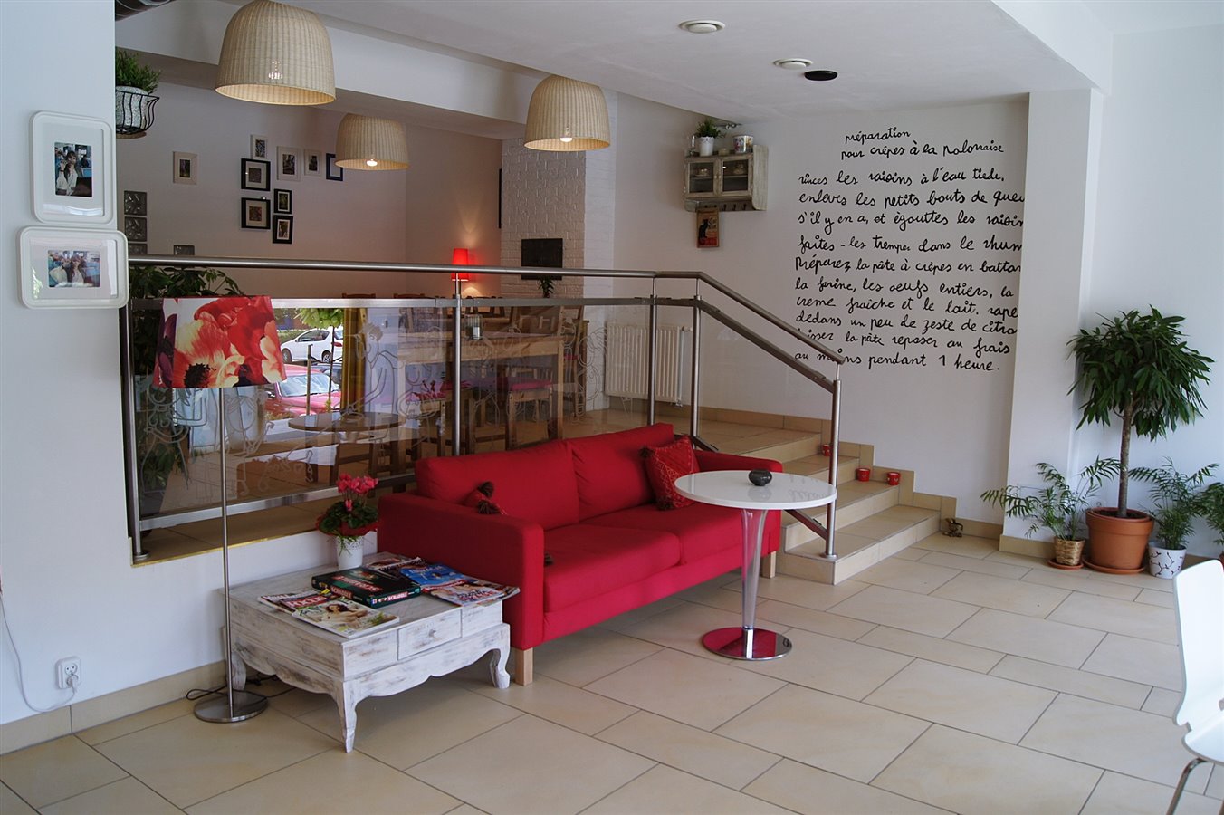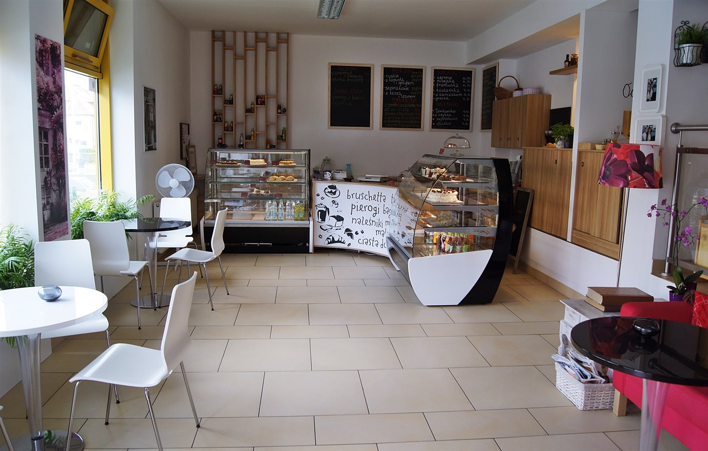 Lokal o powierzchni 112m2, mieści oprócz zaplecza kuchennego (kuchnia, zaplecze na wstępną obróbkę półproduktów, zmywak, niewielki magazynek, pomieszczenie służbowe z toaletą, toaleta dla klientów, dwie części ze stolikami dla klientów (jedno pomieszczenie z 16-ma miejscami siedzącymi, drugie z trzema stolikami kawiarnianymi każdy z 3 krzesłami + kanapa dla 3 osób), część sprzedażową z ladą i witryną cukierniczą.