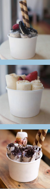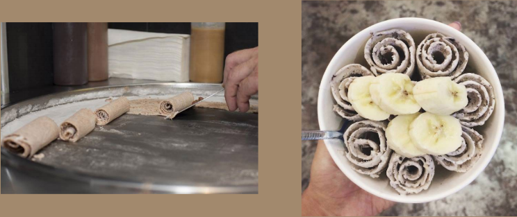 Na płytę o temperaturze -30 stopni wylewamy bazę, dodajemy wybrane przez nas składniki i wszystko razem łączymy, a następnie zwijamy w rolki.